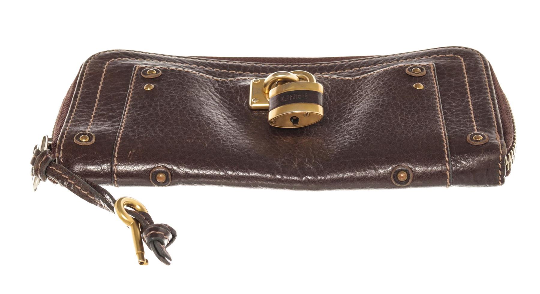 One Chloe Brown Leather Paddington Zippy Wallet. Item is sold AS-IS. All available information is listed in the description and shown in the photo. Chloe Brown Leather Paddington Zippy Wallet with gold and silver tone hardware, brown trim, brown fabric lining, and a zipper closure.