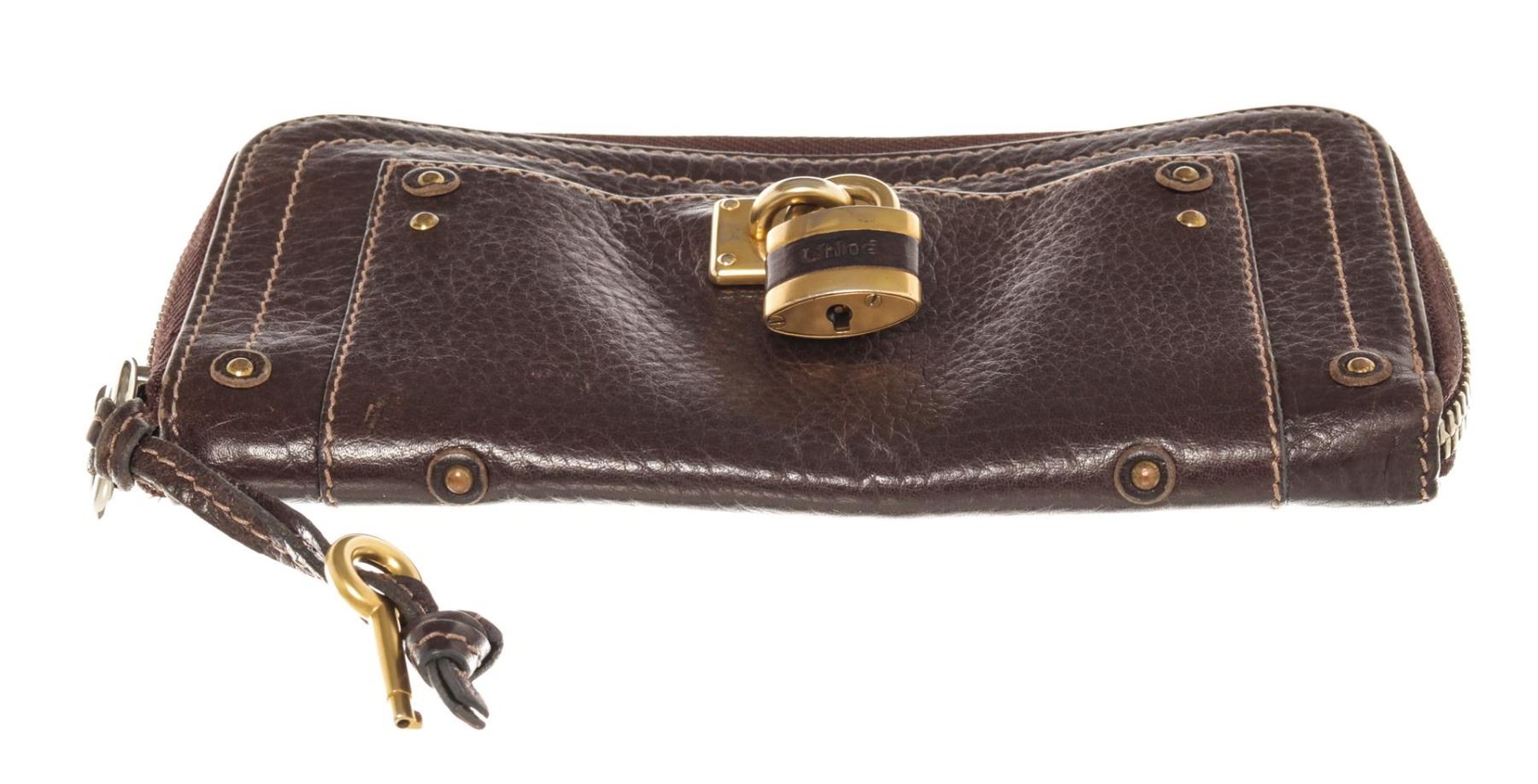 One Chloe Brown Leather Paddington Zippy Wallet. Item is sold AS-IS. All available information is listed in the description and shown in the photo. Chloe Brown Leather Paddington Zippy Wallet with gold and silver tone hardware, brown trim, brown fabric lining, and a zipper closure.