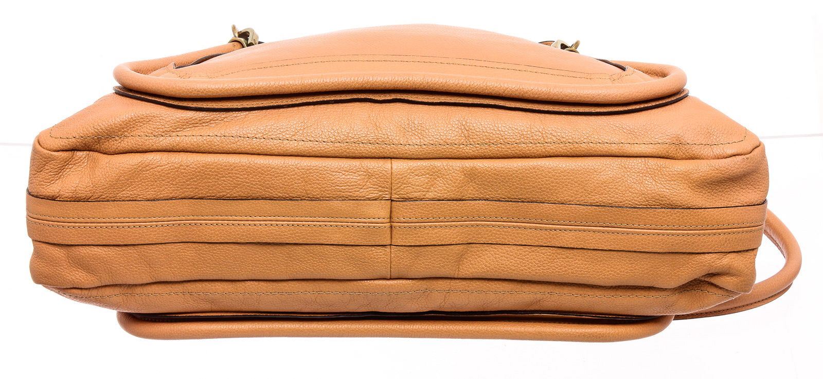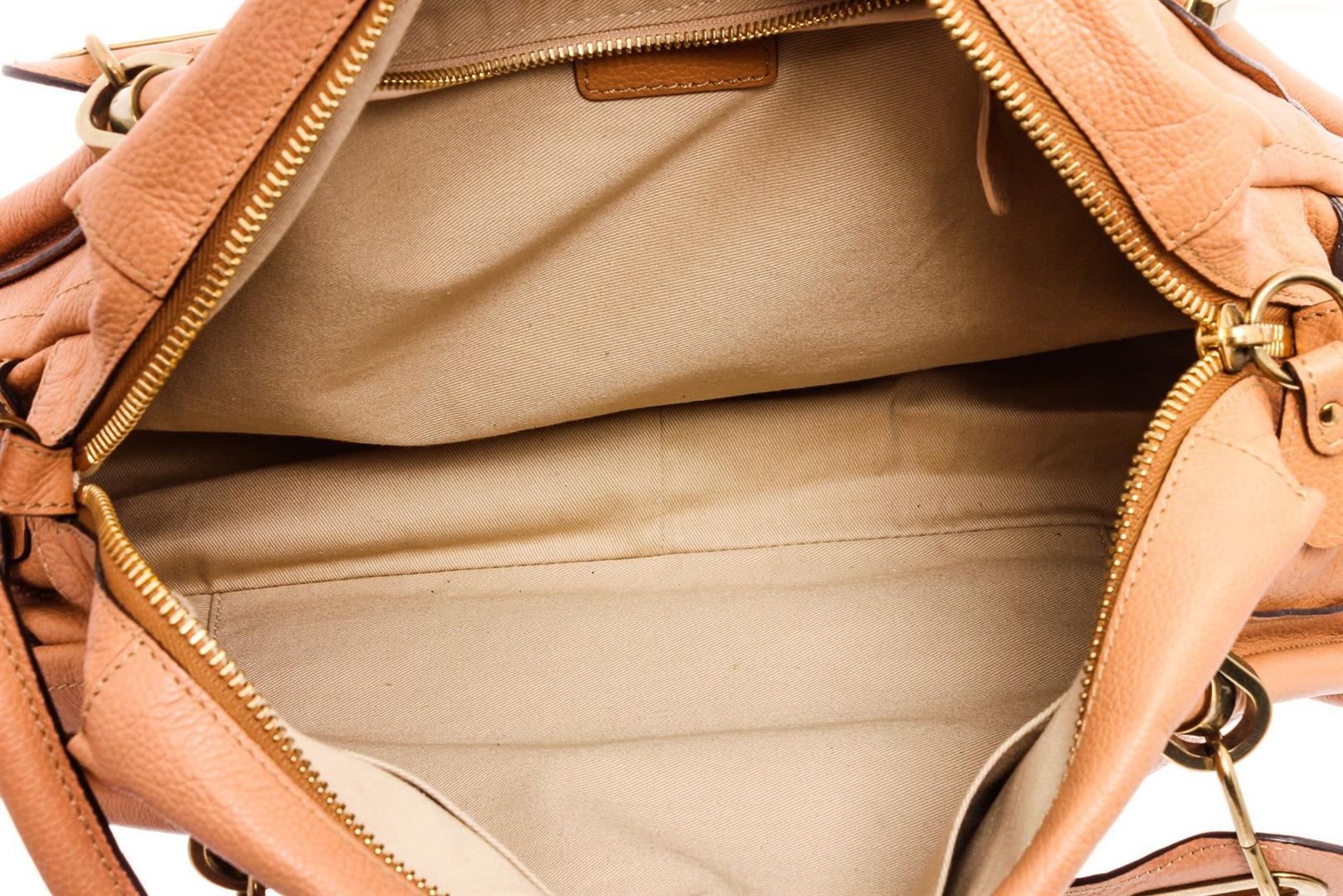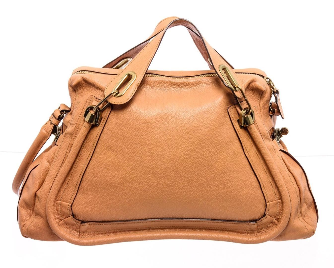 Chloe tan leather Paraty large shoulder bag with gold-tone hardware, dual flat top handles and single rolled shoulder strap, tan canvas lining, two interior pockets; one with zip closure and overall zip closure at top.