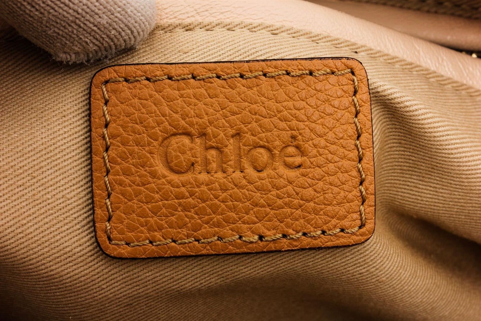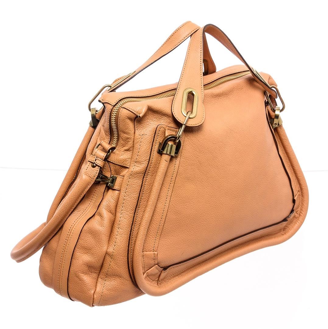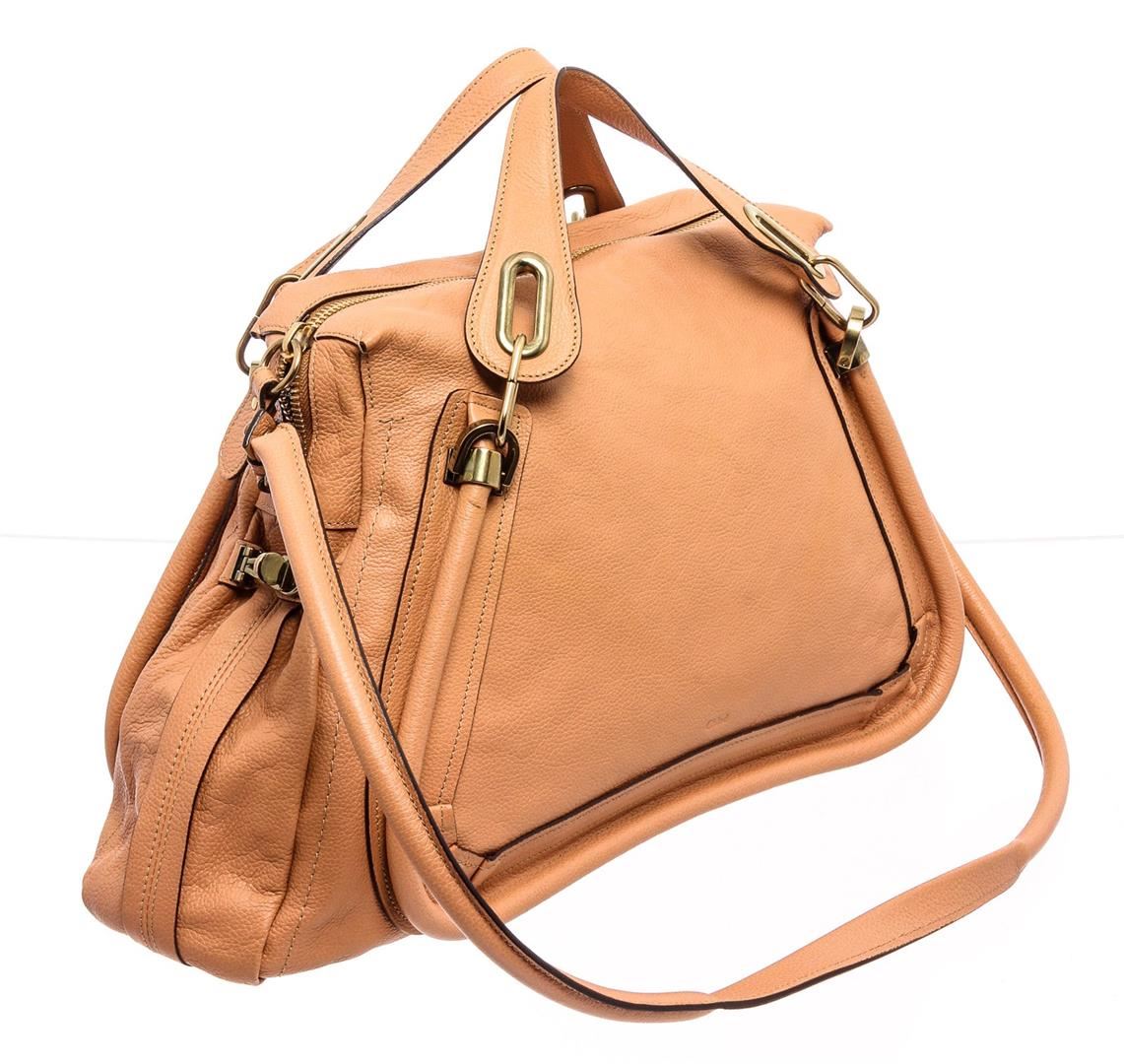 Chloe tan leather Paraty large shoulder bag with gold-tone hardware, dual flat top handles and single rolled shoulder strap, tan canvas lining, two interior pockets; one with zip closure and overall zip closure at top.
