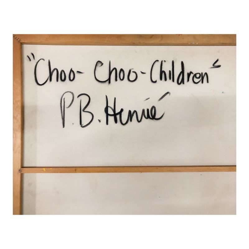 "Choo-Choo Children" is an original oil painting on stretched canvas by Paul Blaine Henrie (1932-1999). The piece is hand signed by the artist and comes with a letter of authenticity. Please note that due to the age of this piece and the way it was stored, there are minor sings of wear, particularly on the corners and edges. Measures approximately. 40" x 72" (image).