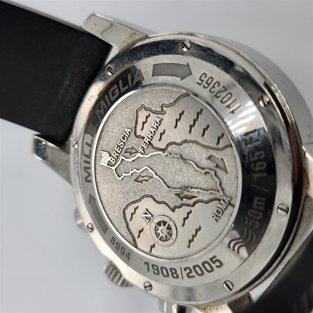 One Chopard 1000 Miglia GMT Chonometer Wristwatch. Stainless steel case with a stainless steel bracelet. Fixed stainless steel bezel with 24 hour markings. Black dial with luminous hands and index hour markers. Minute markers. Tachymeter around the outer rim. Dial Type: Analog. Luminescent hands and markers. Date displays at the 3 o'clock position. Chronograph - three sub-dials displaying: 60 second, 30 minute and 12 hour (dual time zone). Automatic movement. Scratch resistant sapphire crystal. Pull / push crown. Skeleton case back. Case diameter: 42.5 mm. Case thickness: 14.8 mm. Round case shape. Band width: 20 mm. Water resistant at 50 meters / 165 feet. Functions: hours/ minutes/ seconds/ date/ chronograph. Additional Info: powers automatically with the movement of your arm. Sport watch style. Watch label: Swiss Made. Chopard Mille Miglia GMT Steel Men's Watch 15/8992.