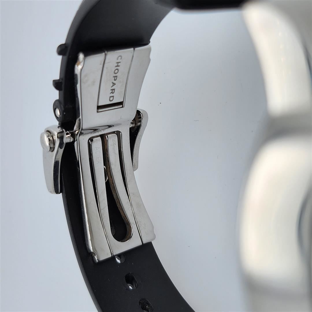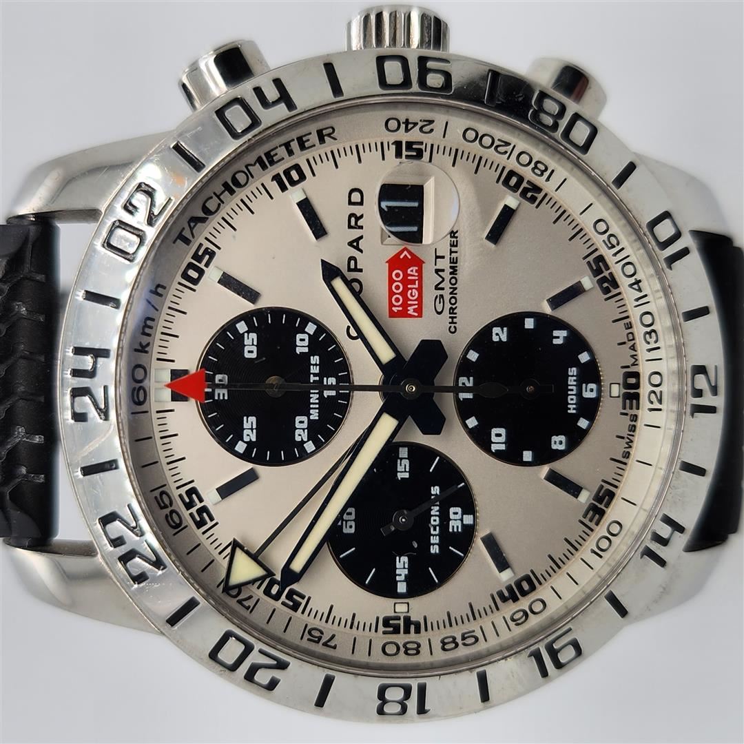 One Chopard 1000 Miglia GMT Chonometer Wristwatch. Stainless steel case with a stainless steel bracelet. Fixed stainless steel bezel with 24 hour markings. Black dial with luminous hands and index hour markers. Minute markers. Tachymeter around the outer rim. Dial Type: Analog. Luminescent hands and markers. Date displays at the 3 o'clock position. Chronograph - three sub-dials displaying: 60 second, 30 minute and 12 hour (dual time zone). Automatic movement. Scratch resistant sapphire crystal. Pull / push crown. Skeleton case back. Case diameter: 42.5 mm. Case thickness: 14.8 mm. Round case shape. Band width: 20 mm. Water resistant at 50 meters / 165 feet. Functions: hours/ minutes/ seconds/ date/ chronograph. Additional Info: powers automatically with the movement of your arm. Sport watch style. Watch label: Swiss Made. Chopard Mille Miglia GMT Steel Men's Watch 15/8992.