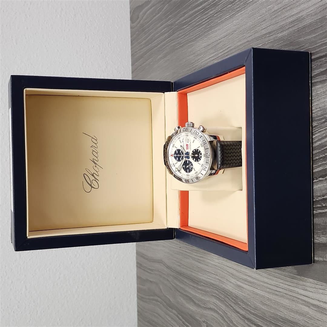 One Chopard 1000 Miglia GMT Chonometer Wristwatch. Stainless steel case with a stainless steel bracelet. Fixed stainless steel bezel with 24 hour markings. Black dial with luminous hands and index hour markers. Minute markers. Tachymeter around the outer rim. Dial Type: Analog. Luminescent hands and markers. Date displays at the 3 o'clock position. Chronograph - three sub-dials displaying: 60 second, 30 minute and 12 hour (dual time zone). Automatic movement. Scratch resistant sapphire crystal. Pull / push crown. Skeleton case back. Case diameter: 42.5 mm. Case thickness: 14.8 mm. Round case shape. Band width: 20 mm. Water resistant at 50 meters / 165 feet. Functions: hours/ minutes/ seconds/ date/ chronograph. Additional Info: powers automatically with the movement of your arm. Sport watch style. Watch label: Swiss Made. Chopard Mille Miglia GMT Steel Men's Watch 15/8992.
