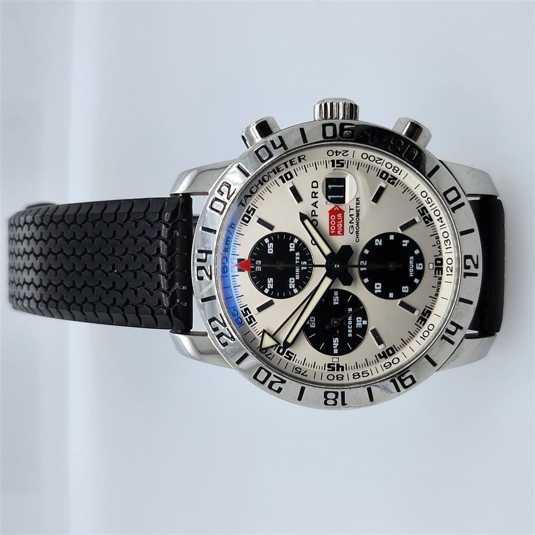 One Chopard 1000 Miglia GMT Chonometer Wristwatch. Stainless steel case with a stainless steel bracelet. Fixed stainless steel bezel with 24 hour markings. Black dial with luminous hands and index hour markers. Minute markers. Tachymeter around the outer rim. Dial Type: Analog. Luminescent hands and markers. Date displays at the 3 o'clock position. Chronograph - three sub-dials displaying: 60 second, 30 minute and 12 hour (dual time zone). Automatic movement. Scratch resistant sapphire crystal. Pull / push crown. Skeleton case back. Case diameter: 42.5 mm. Case thickness: 14.8 mm. Round case shape. Band width: 20 mm. Water resistant at 50 meters / 165 feet. Functions: hours/ minutes/ seconds/ date/ chronograph. Additional Info: powers automatically with the movement of your arm. Sport watch style. Watch label: Swiss Made. Chopard Mille Miglia GMT Steel Men's Watch 15/8992.