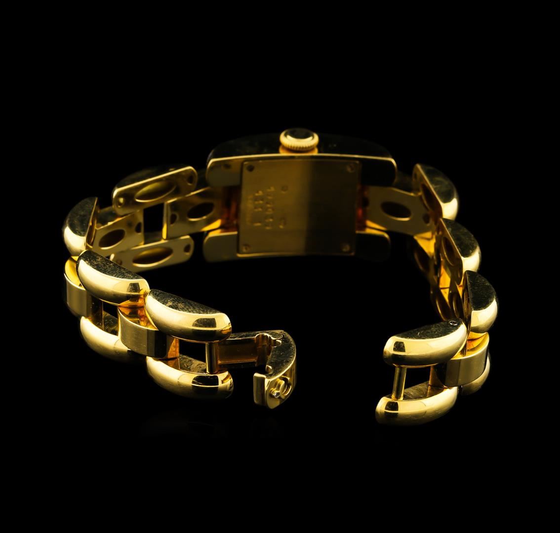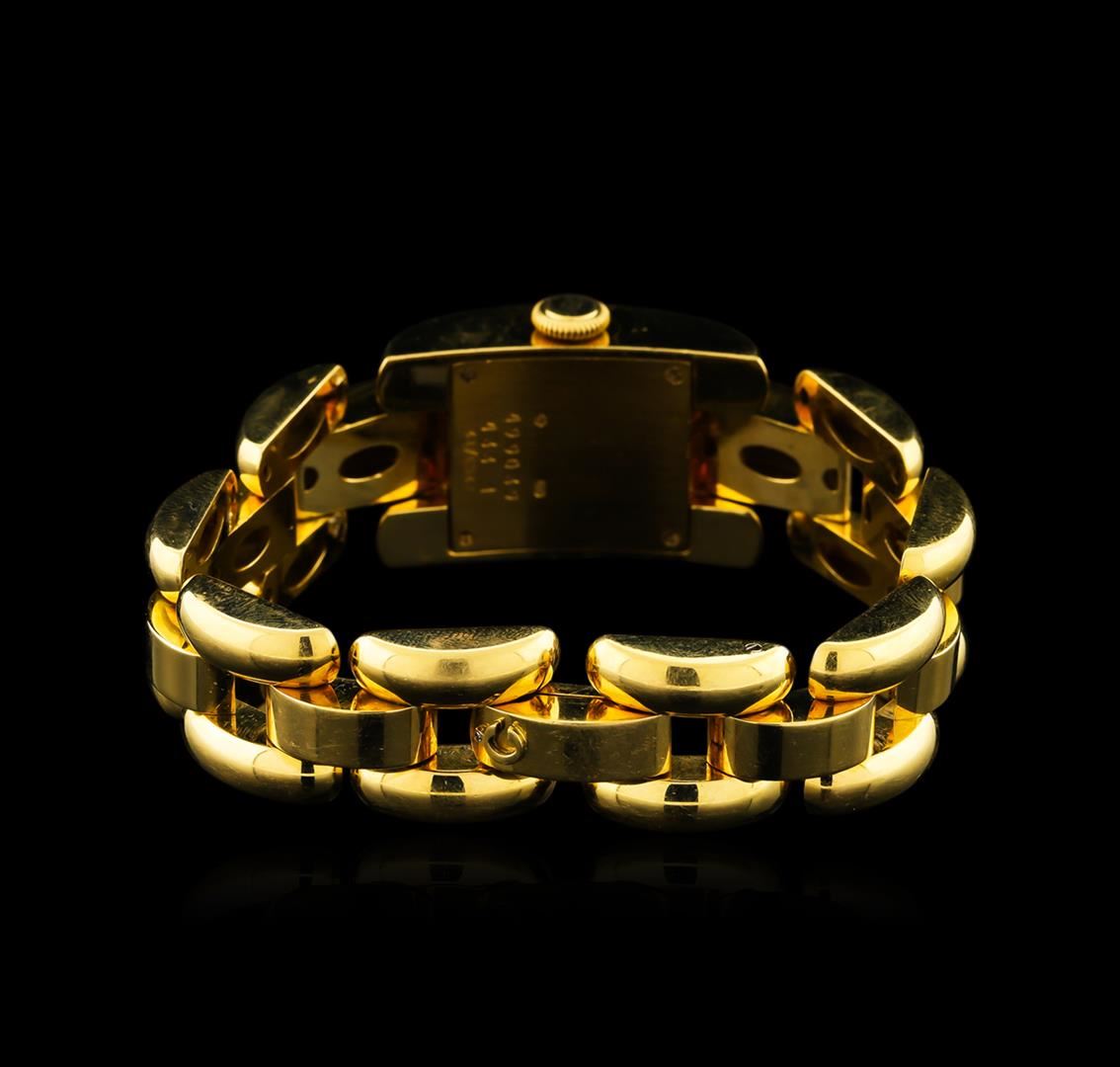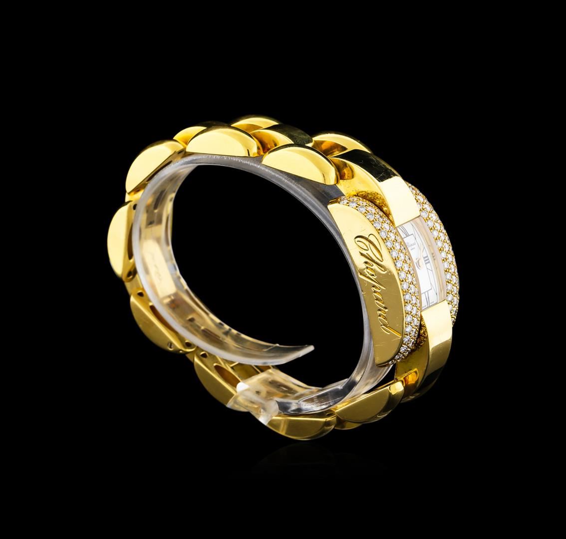 One ladies, Chopard La Strada diamond wrist watch electronically tested 18KT yellow gold, Case: 30 x 18mm, tank style, Case Back: secured by four set screws, engraved with the manufacturers ID numbers, Bezel: diamond set, Crown: scalloped, Crystal: synthetic sapphire, Movement: Swiss quartz. Dial: White, with baton pointed hands and four Roman numerals, Case Lugs: fixed, Bracelet: 18KT yellow gold Chopard La Strada link, Condition: G-5 Fine. Six inch length. Overlocking clasp, with logo. Containing: One Hundred Sixteen round brilliant cut diamonds, measuring an average of 1.60mm in diameter, approximate total weight = 1.75ct. Graded in the setting. Clarity: VVS-2. Color: E - G. Total Weight of Diamonds 1.75ct. Total Weight of Watch 87.92gm. AIG Appraised at $20,100.00.