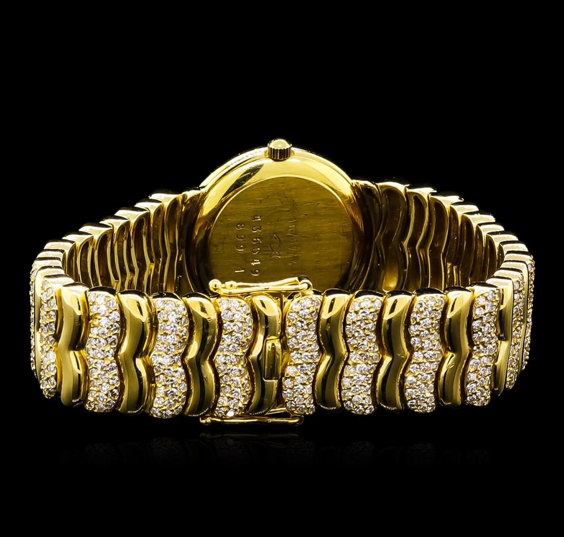 One ladies, Chopard Diamond wrist watch electronically tested 18KT yellow gold, Case: 23mm, Case Back: space available for engraving, Crown: scalloped, Bezel: diamond set, Crystal: synthetic sapphire, Circa: 1980's.Movement: quartz, Chopard signed Dial: mother of pearl, with baton narrow hands, Chopard Bracelet: 18KT yellow gold, alternating yellow gold and diamond set links, Condition: G-6 Extra Fine. Bright polish finish. Six and one quarter inch length. Chopard signed concealed clasp, with twin safeties. Containing: Approximately Six Hundred Fifty round brilliant & single cut diamonds approximate total weight = 5.00ct. Graded in the settings. Clarity: VVS-2 to VS-2. Color: F - G. Total Weight of Diamonds 5.00ct. Total Weight of Watch 83.06gm. AIG Appraised at $28,000.00.