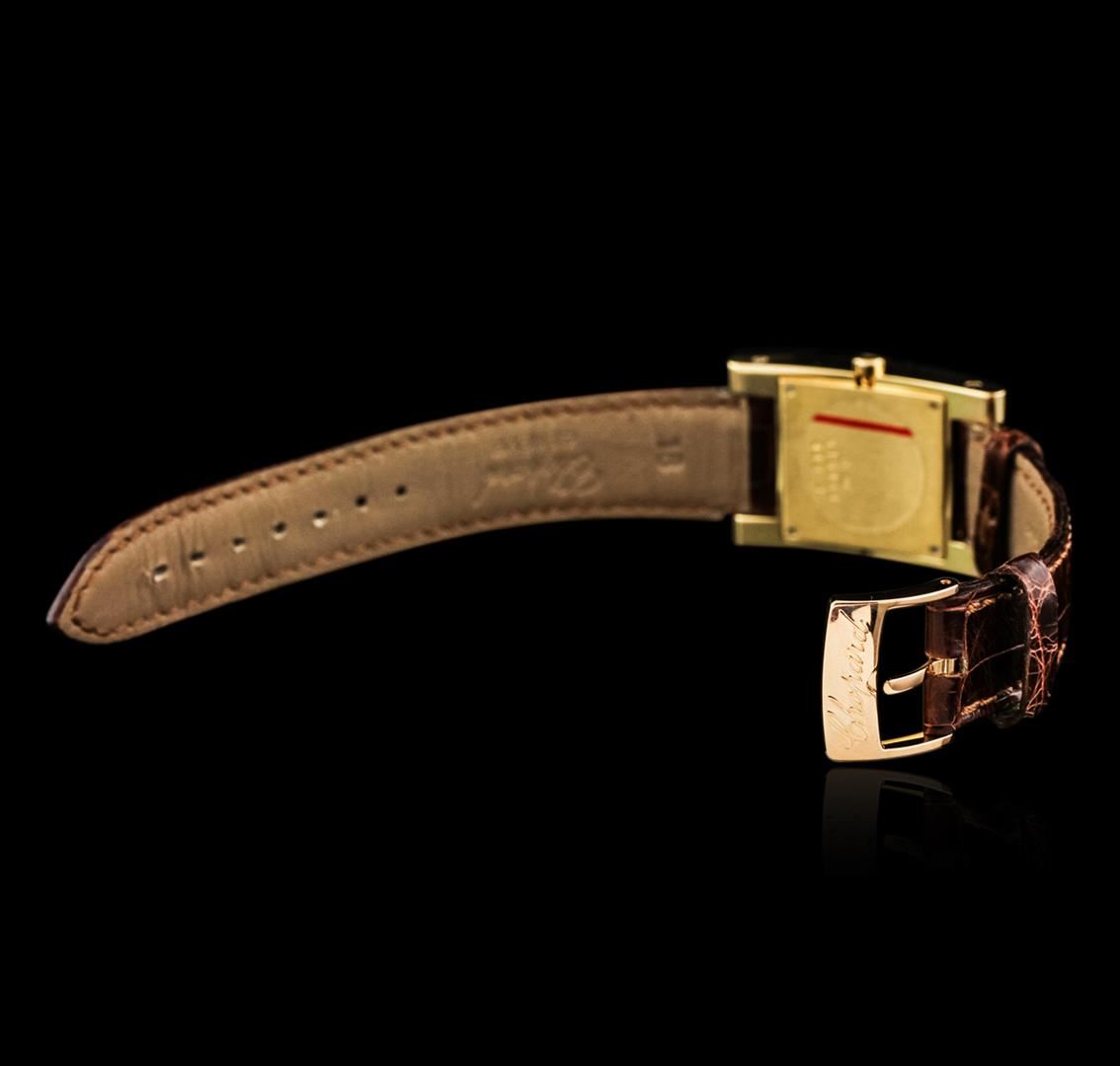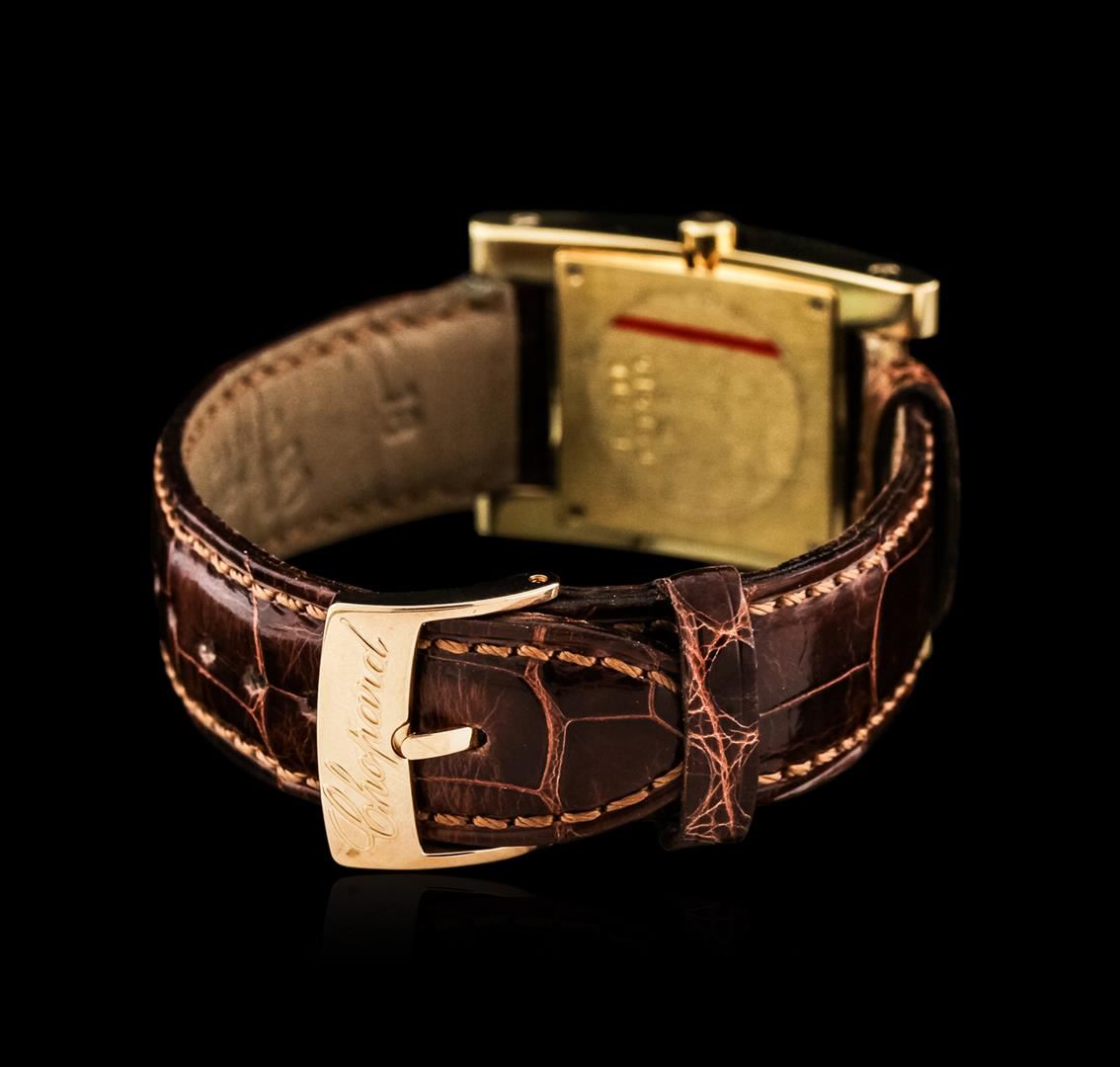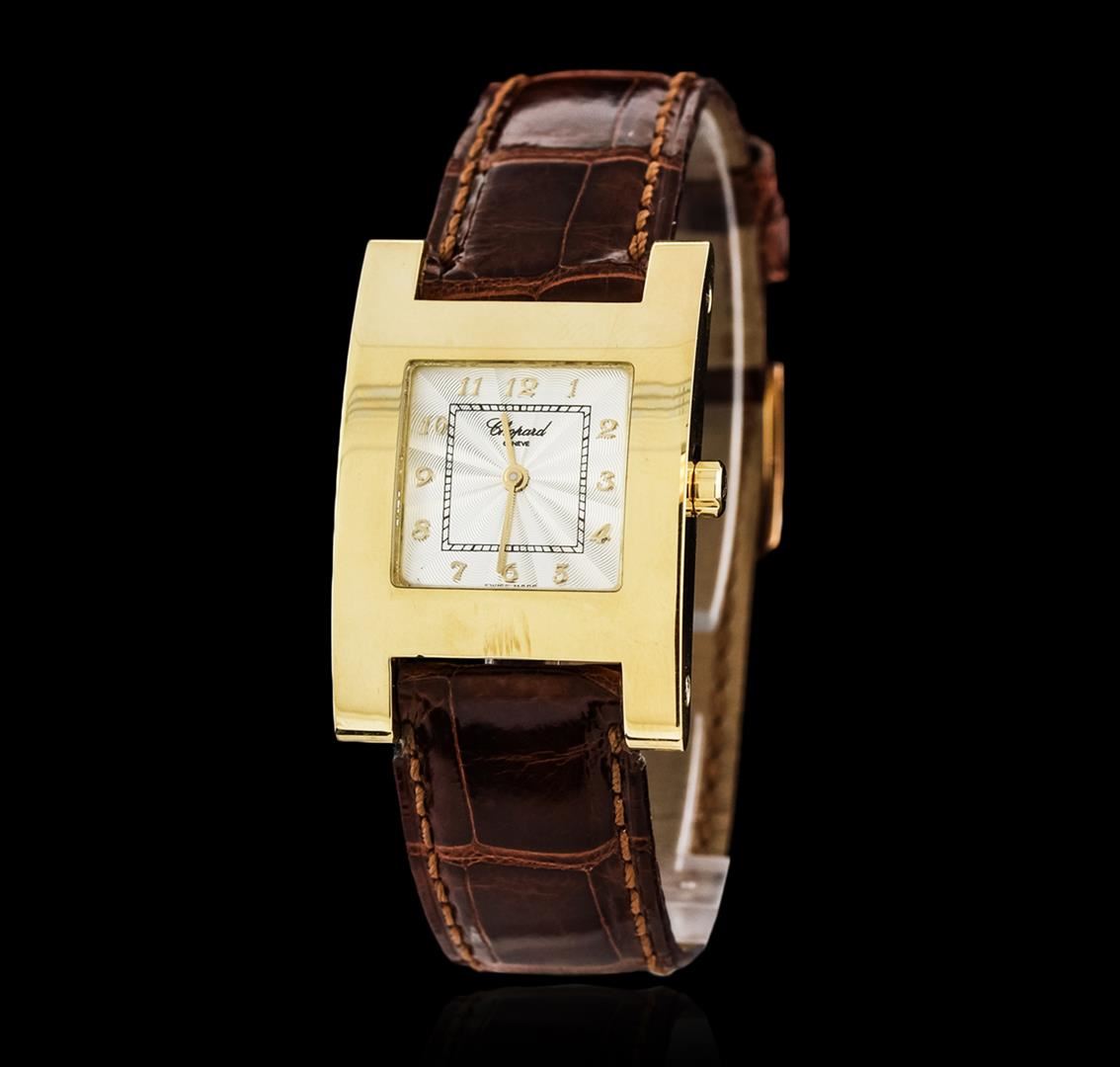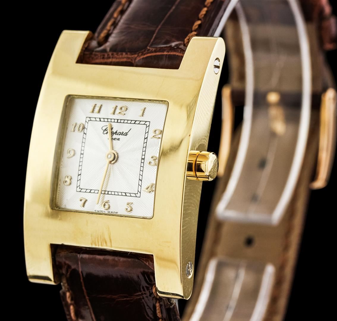 One, Chopard H Square wristwatch, electronically tested 18KT yellow gold, Case: 36 x 25mm, the case is engraved CHOPARD on the 9 o'clock side of the case, Case Back: secured by four set screws, engraved with the manufacturers ID numbers, Crown: engraved with the manufacturers logo, Bezel: high polish, Integral Case Lug Terminals: secured by set screws, Crystal: synthetic sapphire. Movement: quartz, Dial: Silvered Sun Burst, pointed hands and numerals, Chopard Bracelet: saddle stitched leather strap, Condition: G-5 Fine. Seven inch length, adjustable. 18KT gold Chopard buckle. Total Weight of Watch 47.90 grams. AIG Appraised at $7,050.00.