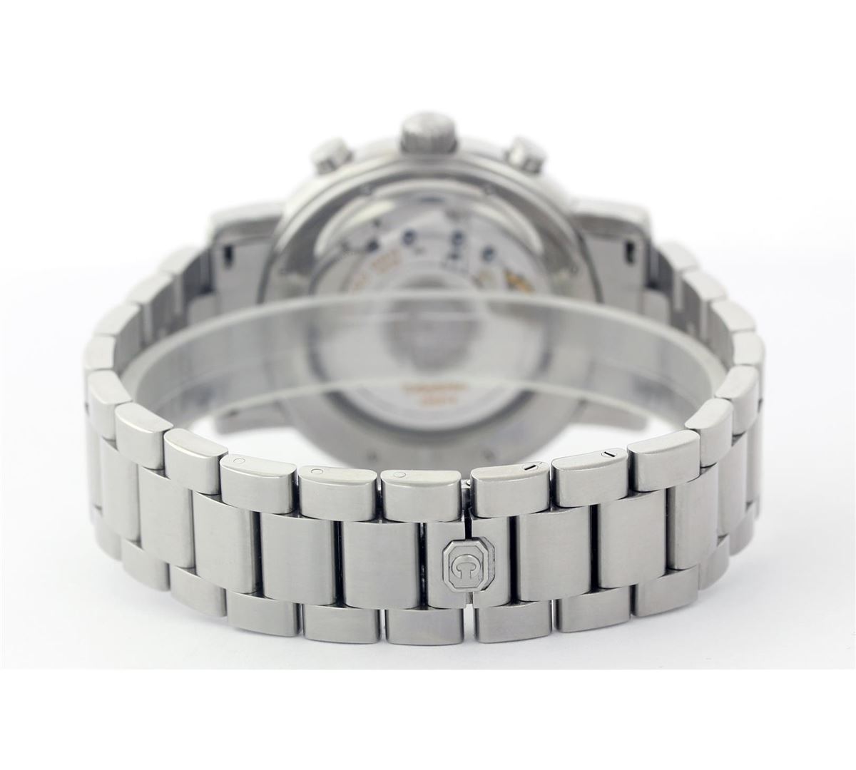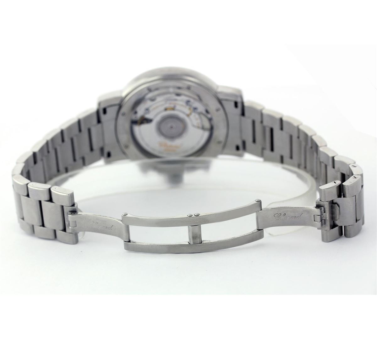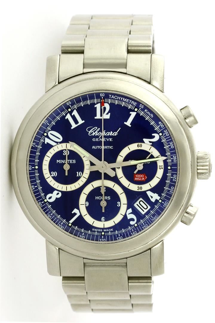 One Gents Stainless Steel Chopard Mille Miglia, Serviced & Electronically Tested, Case:39mm Stainless Steel, Stainless Steel Crown, Bezel: Stainless Steel Bezel, Crystal: Sapphire Lens. Movement: Automatic Movement. Dial: Blue Arabic With Chronograph Date At 4'O Clock Position. Model# 8331 Condition: G-6 Extra Fine. Band: Stainless Steel Band, 6.5 Inch Length, Adjustable. Standard Stainless Steel Chopard Hidden Clasp.