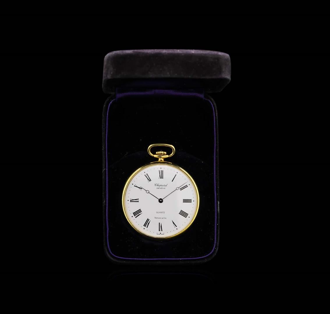 One, Chopard for Tiffany & Co. open face pocket watch electronically tested 18KT yellow gold, Bezel: polished, Crystal: acrylic, Case: 49mm diameter, the reverse side is engraved. Movement: Chopard unadjusted six jewel quartz, Battery Number: 392, Chopard and Tiffany & Co. signed Dial: White color, with Breguet hands, minute division track, and Roman numerals, Condition: G-4 Average. Total Weight of Watch 72.15 grams. AIG Appraised.