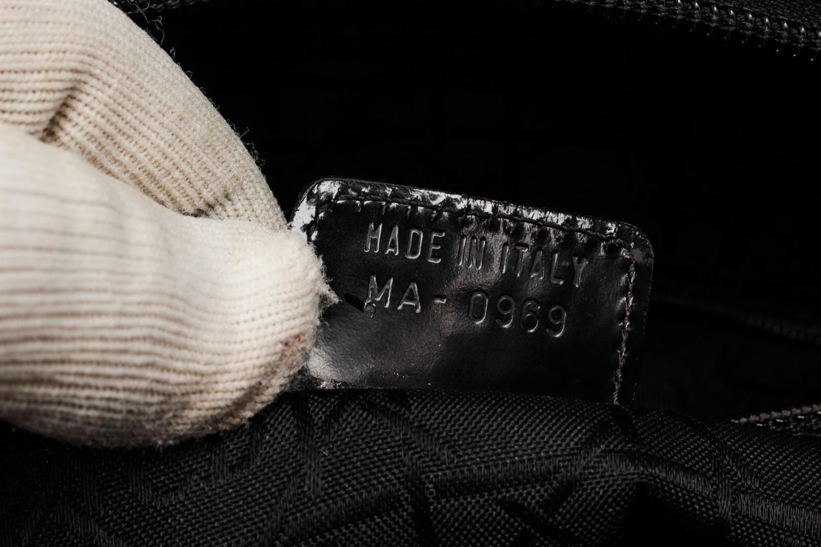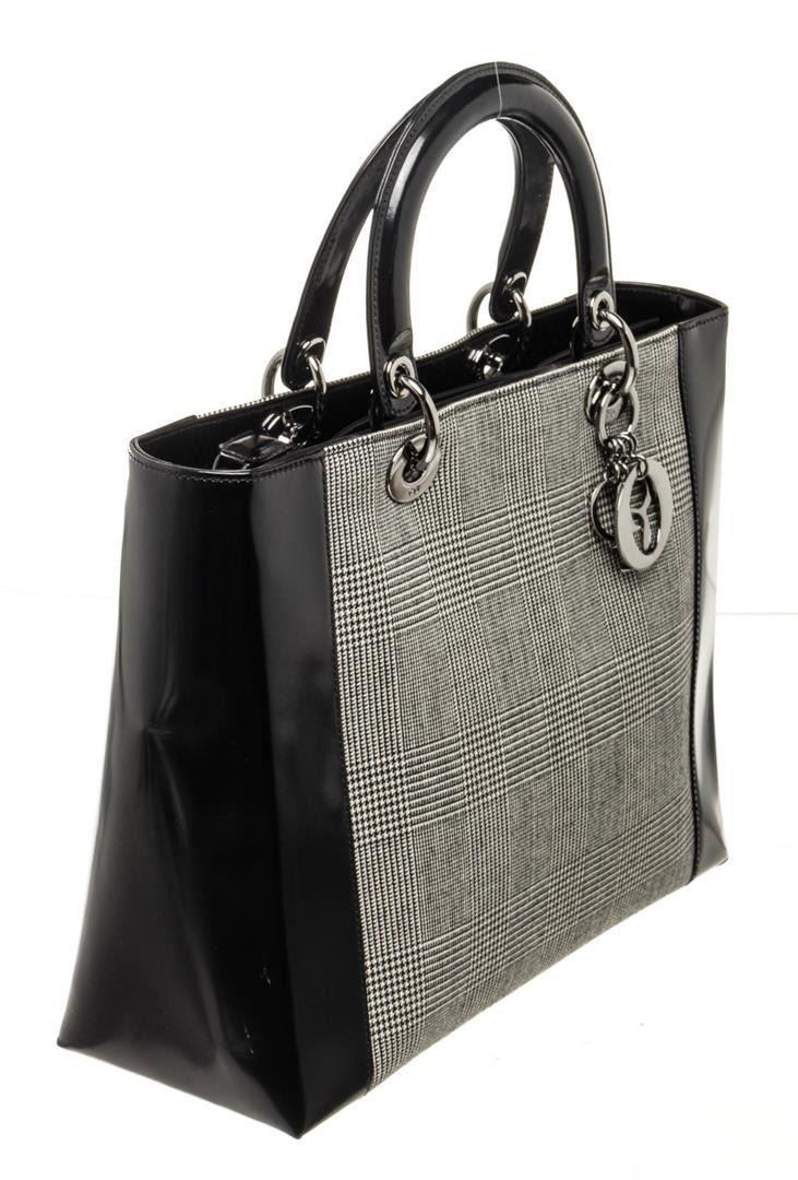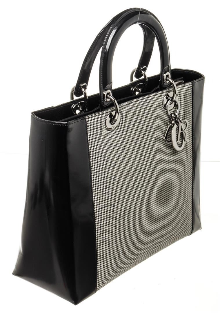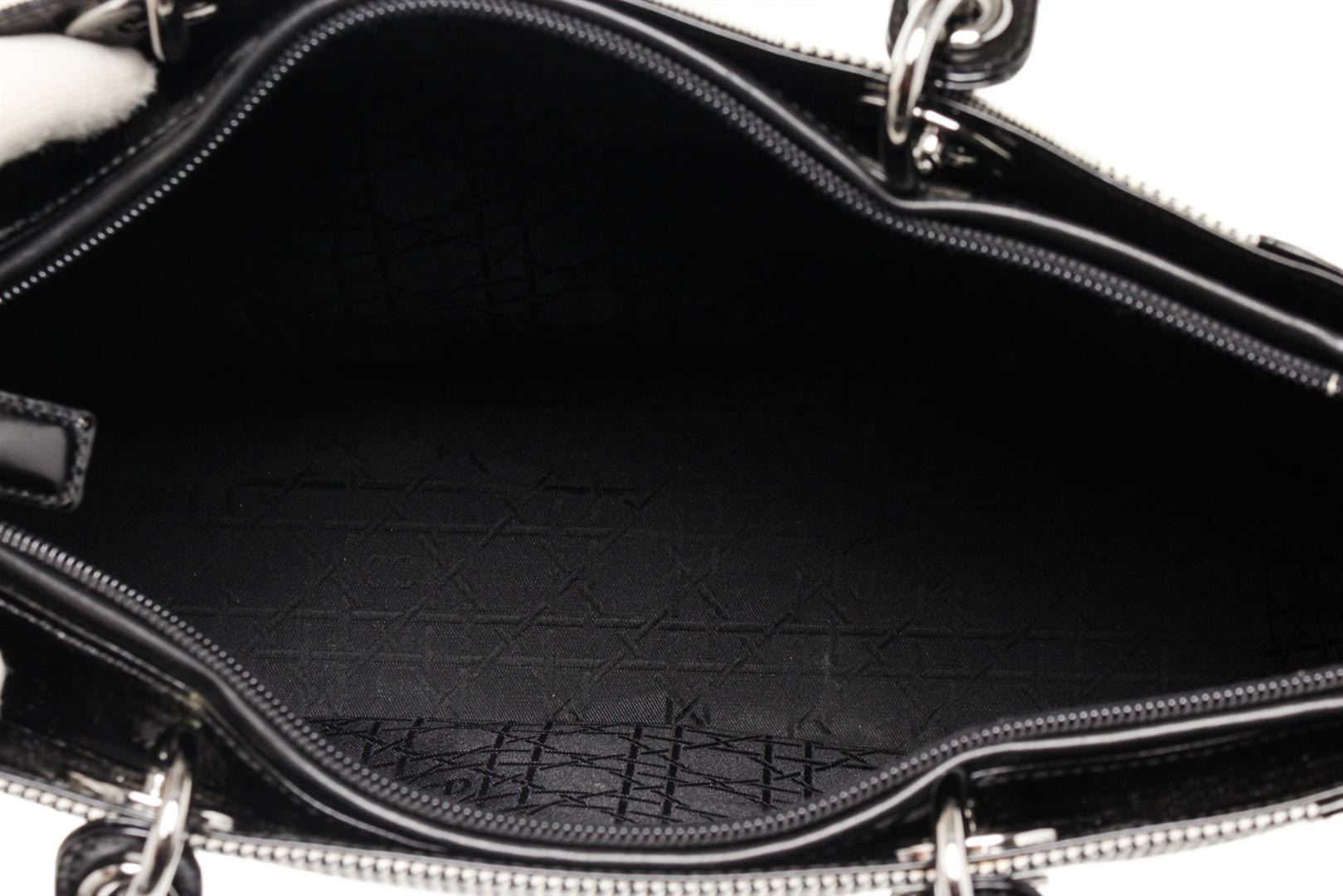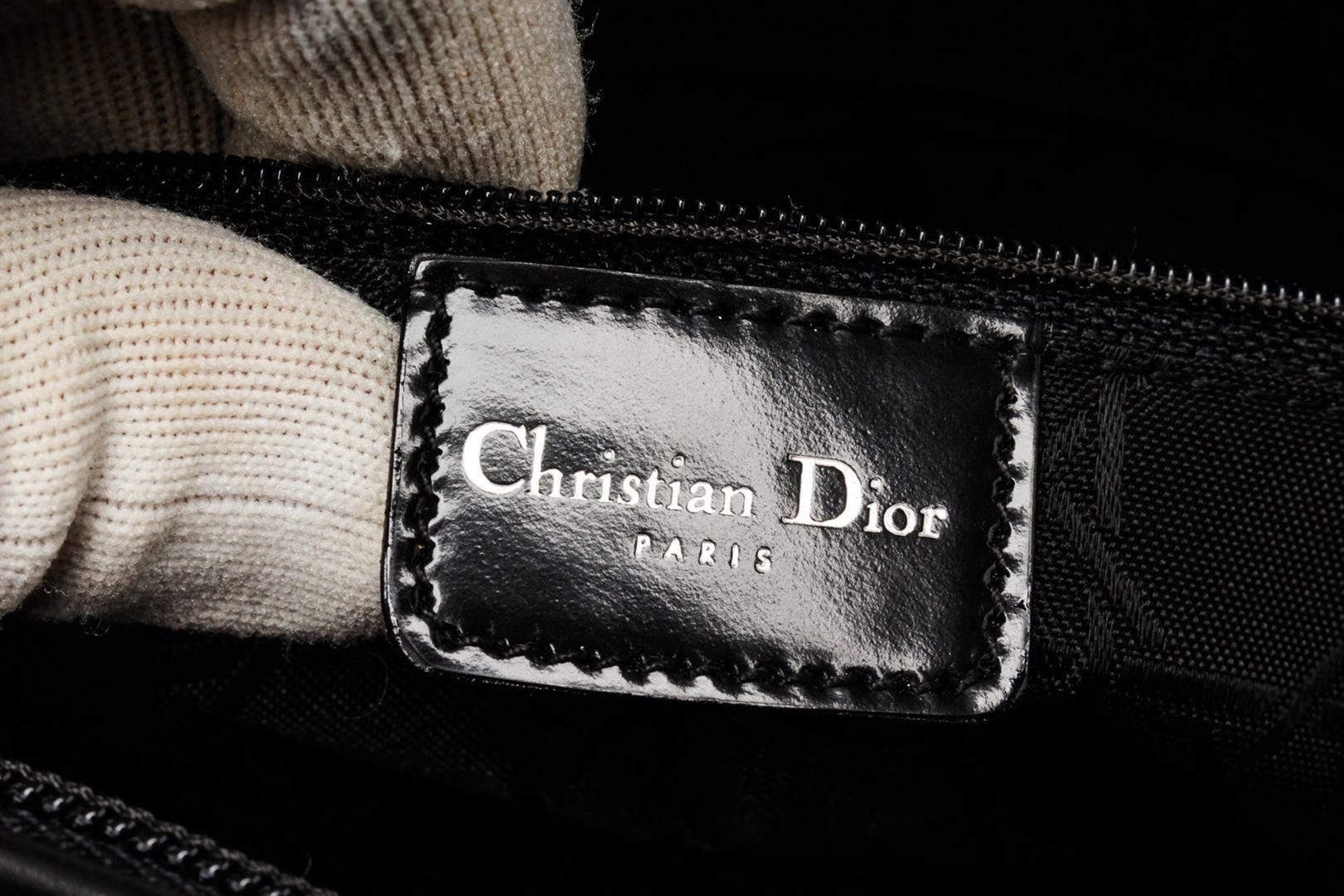 Christian Dior Black Lady Leather Handbag with leather, gold-tone hardware, trim leather, dual top handle and zipper closure.