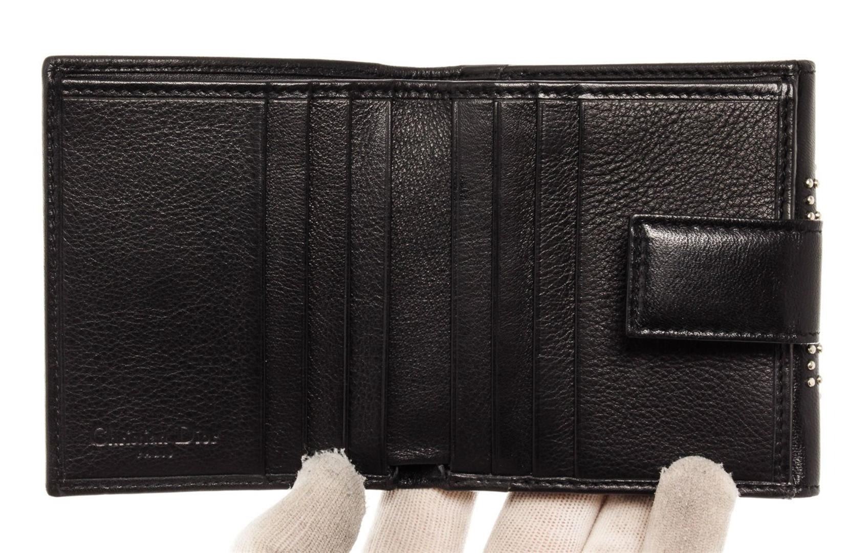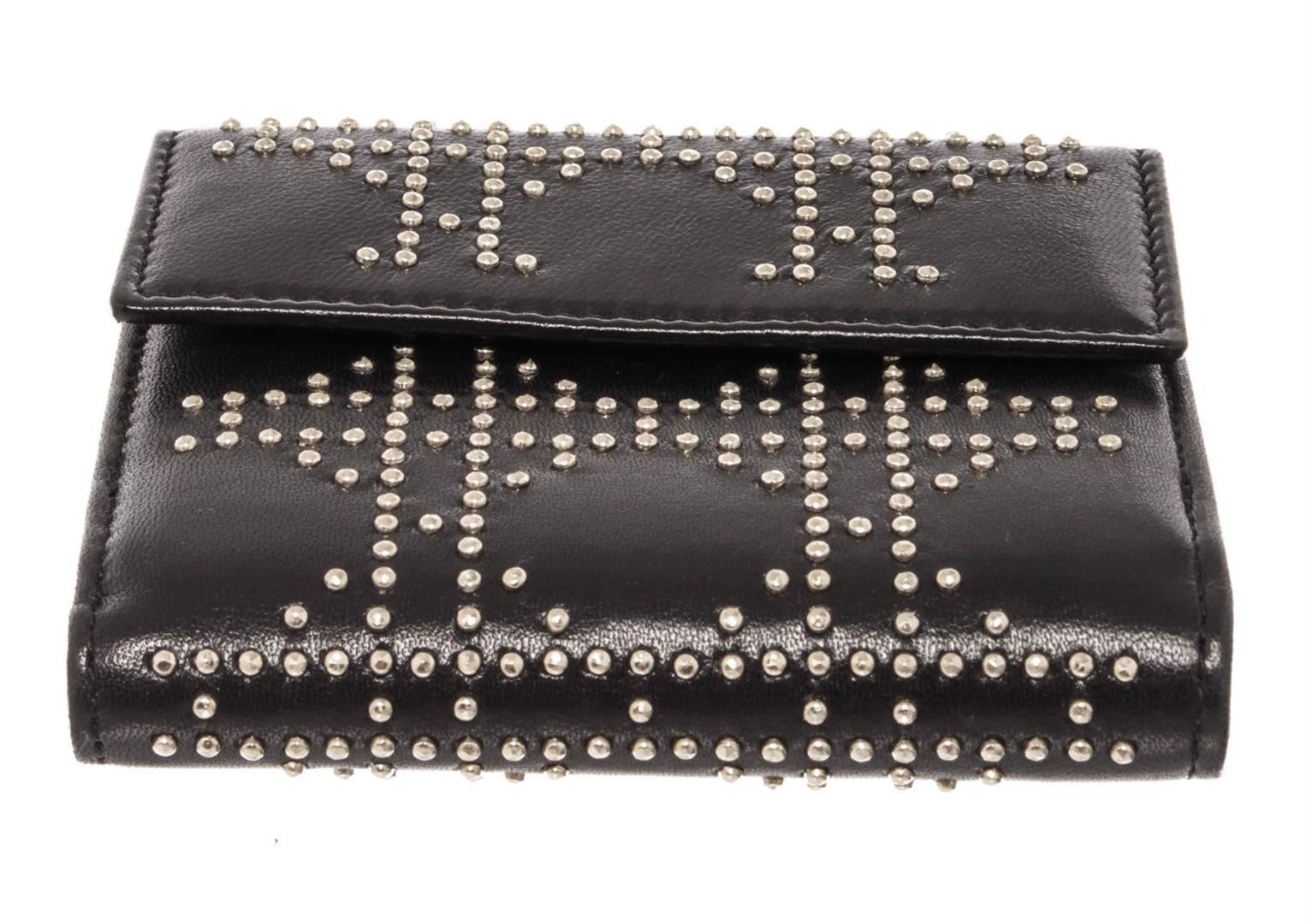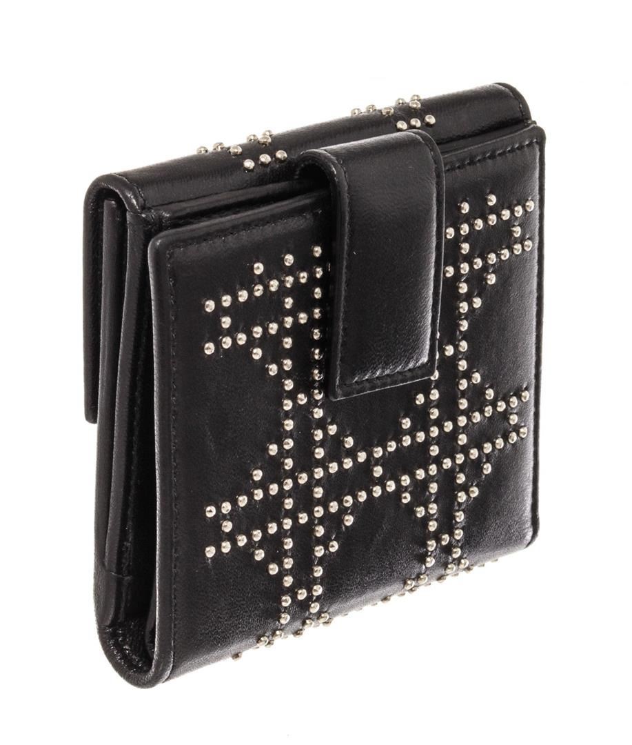 Christian Dior Cannage Bifold Wallet features black studded Lambskin leather, silver-tone hardware, one flap coin pocket with stud closure, six card slots and one flat pocket with black leather trim.