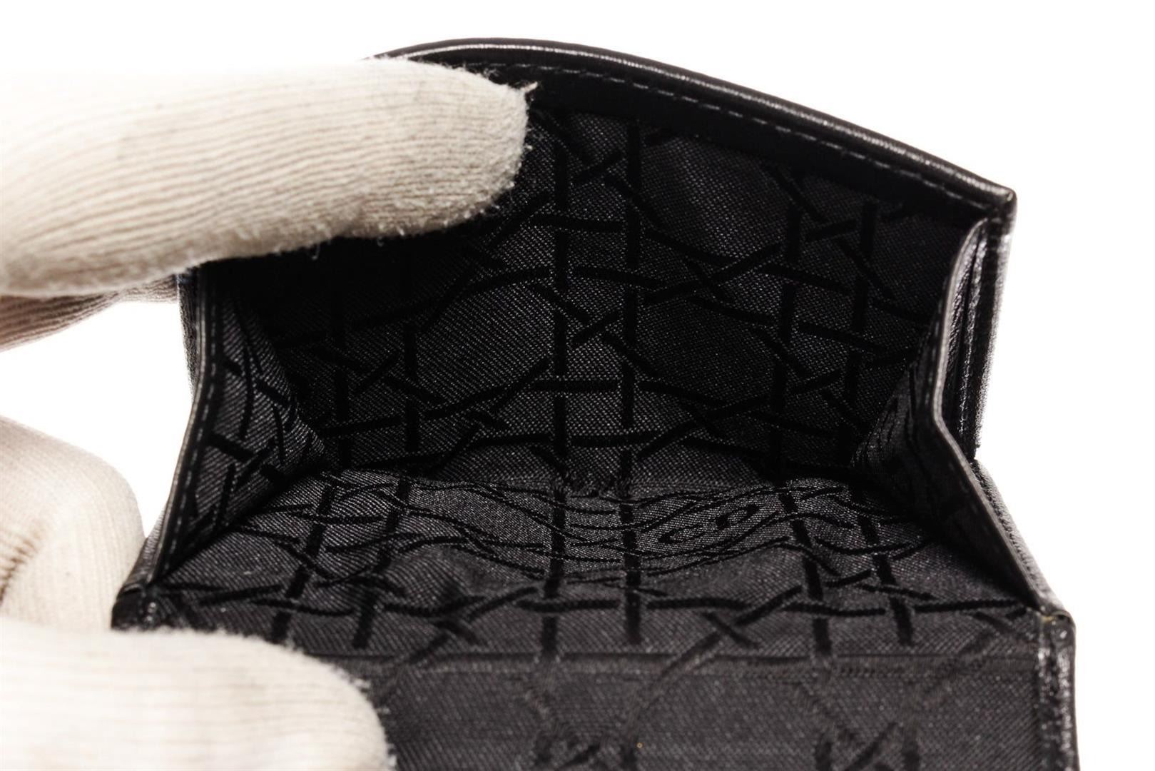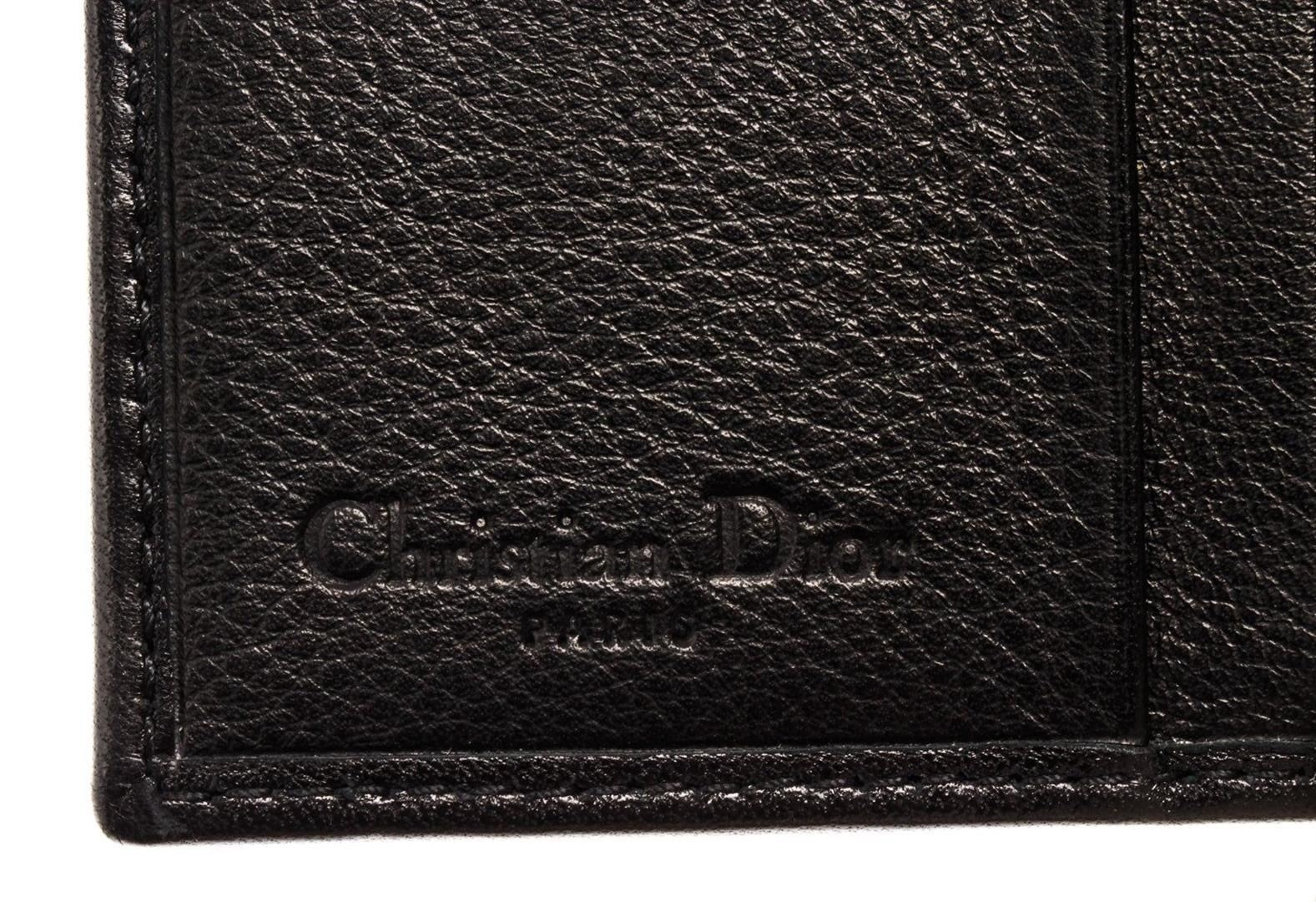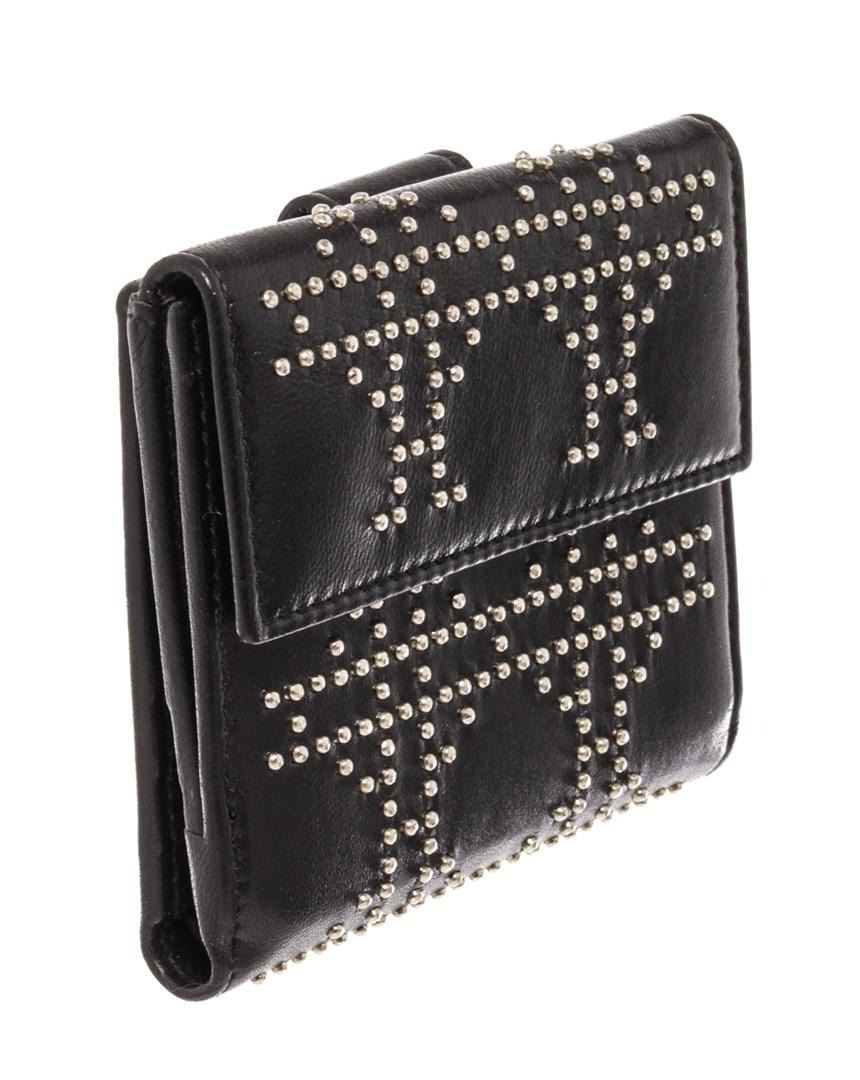 Christian Dior Cannage Bifold Wallet features black studded Lambskin leather, silver-tone hardware, one flap coin pocket with stud closure, six card slots and one flat pocket with black leather trim.