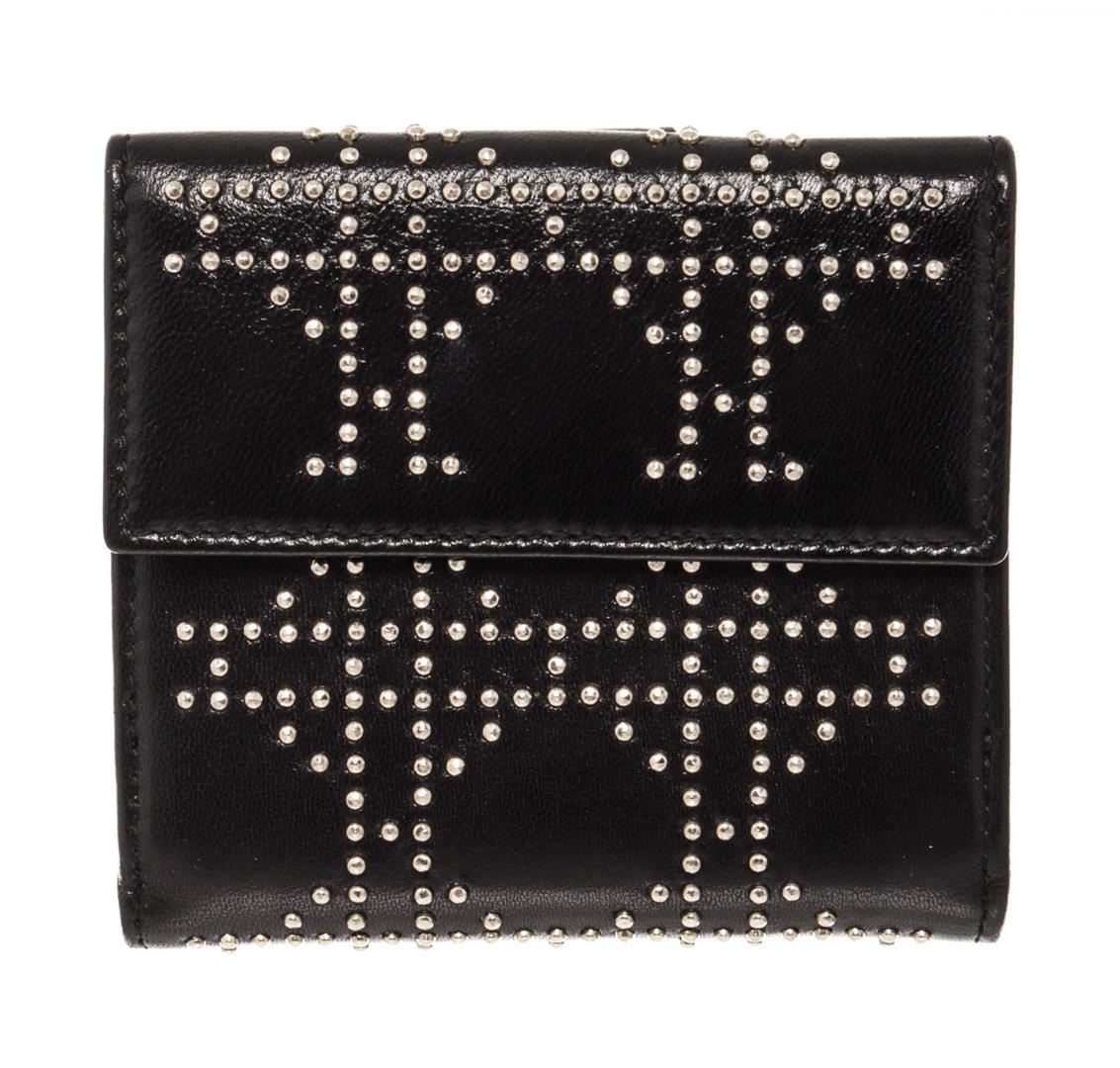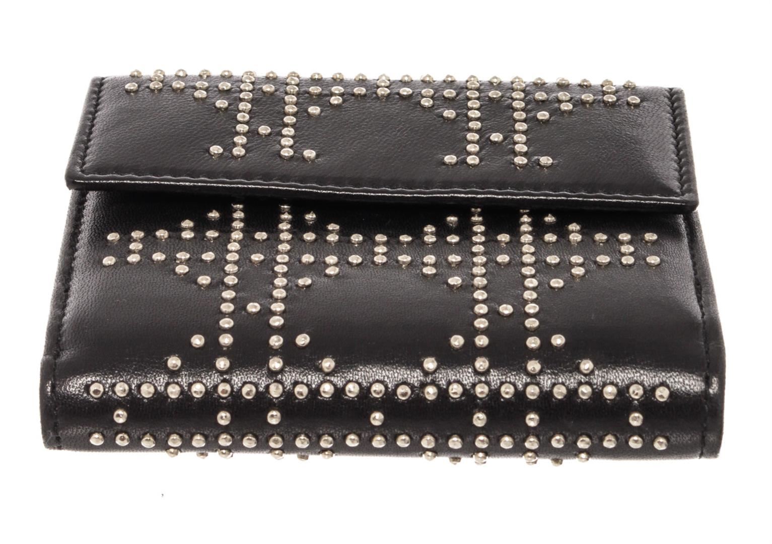 One Christian Dior Black Lambskin Leather Cannage Studded Bifold Wallet. Item is sold AS-IS. Please check photos and descriptions for all available details. Christian Dior Cannage Bifold Wallet features black studded Lambskin leather, silver-tone hardware, one flap coin pocket with stud closure, six card slots and one flat pocket with black leather trim. Height 4", Width 4", Depth 0.5"