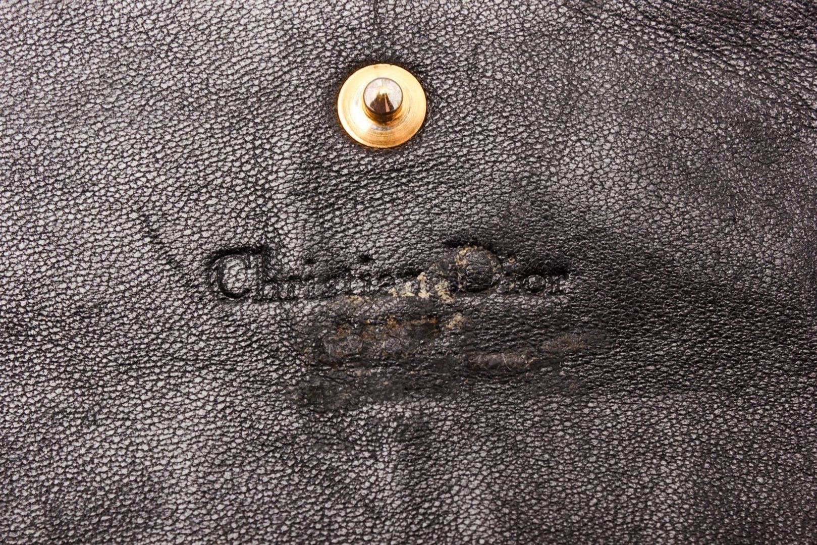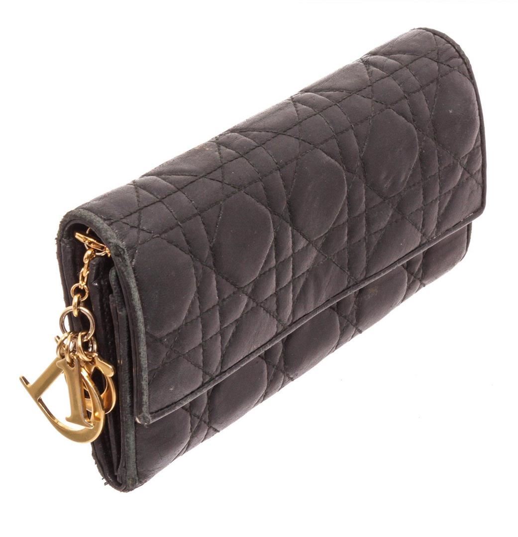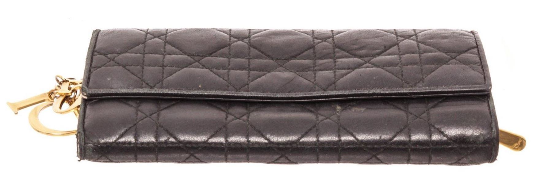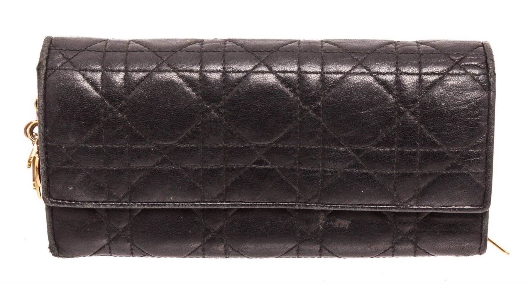 Christian Dior Black Leather Wallet On Chain with silver-tone hardware, single exterior zip pocket, black leather interior, single bill compartment, four interior slit pockets, twelve card slots and snap closure at front flap featuring logo adornment.