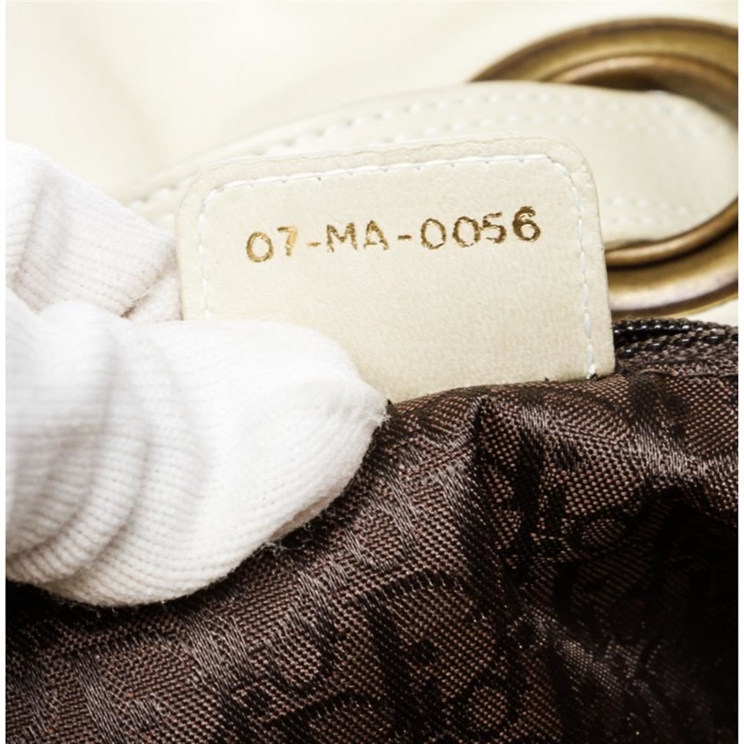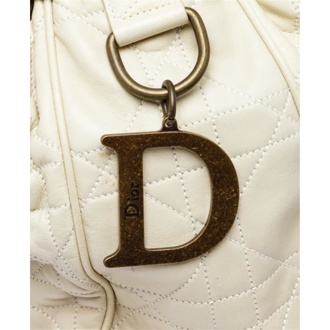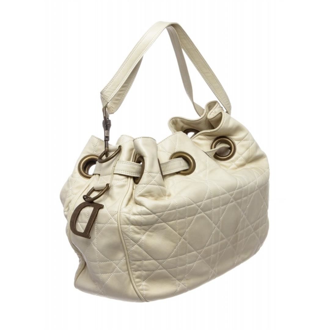 Crafted out of quilted lambskin leather in the signature geometric embroidered quilt. The bag has a double leather top cinch cord that extends out of the bag and loops over to form shoulder straps. The interior is a Dior logo jacquard weave fabric with zipper and patch pockets. Item is pre-owned.