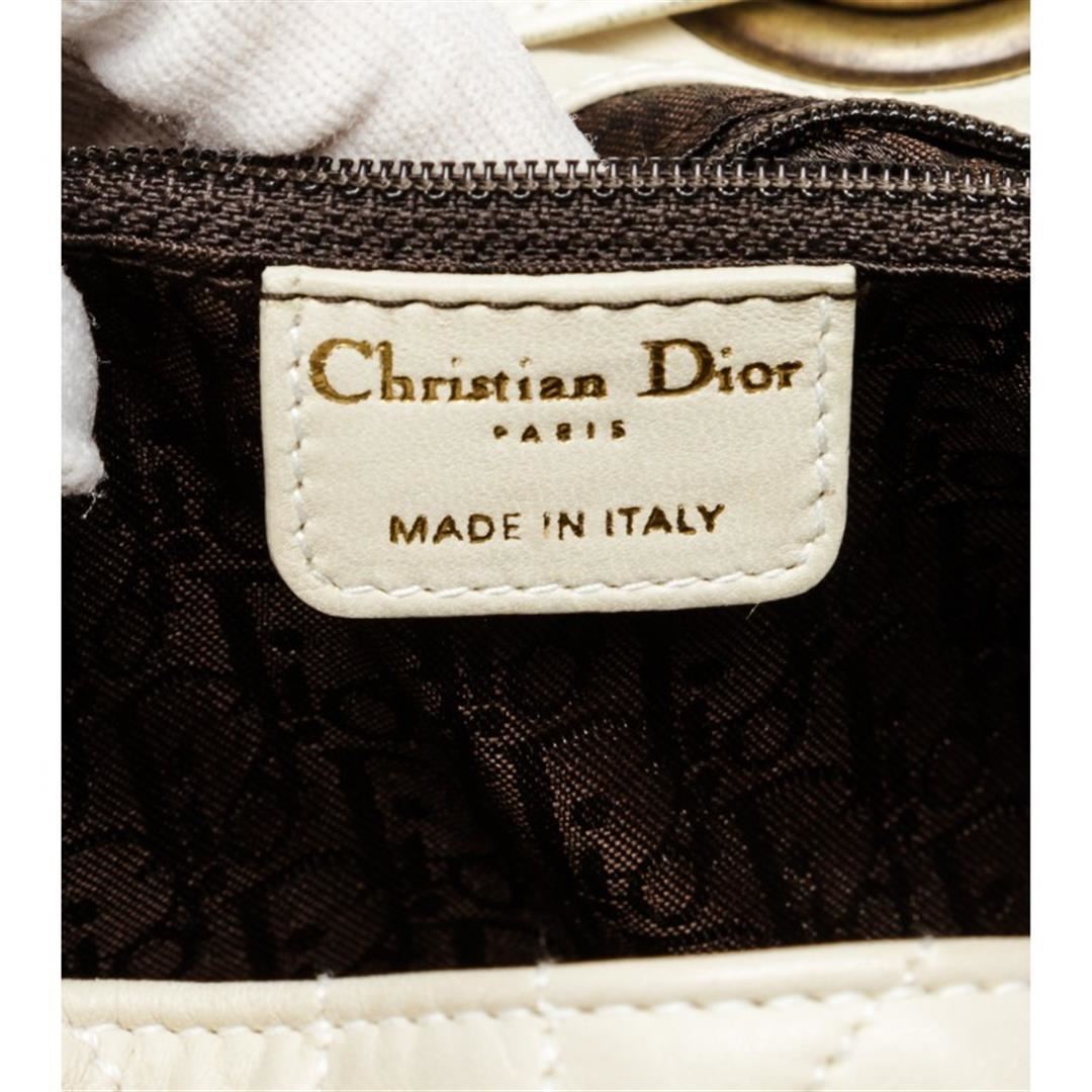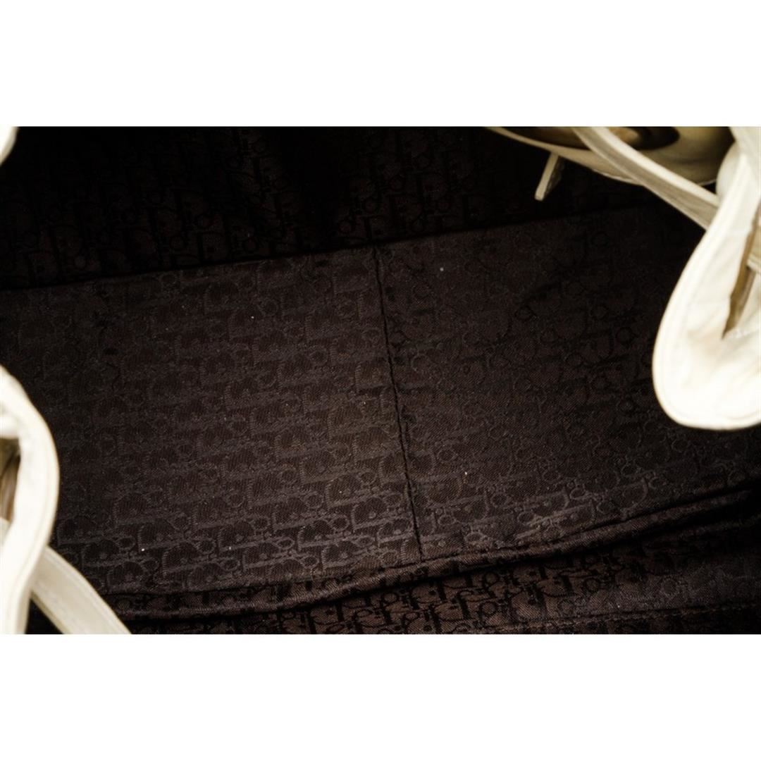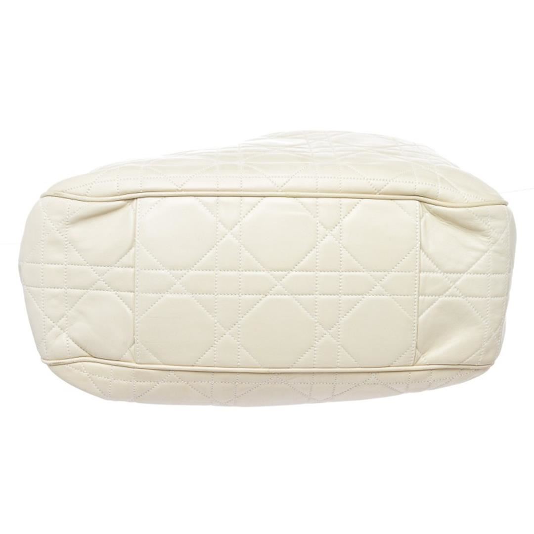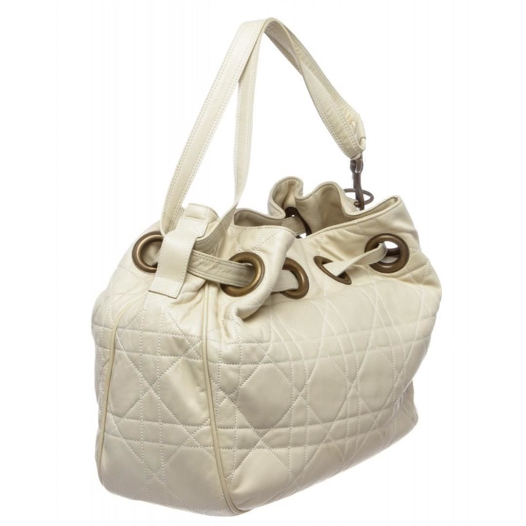 Crafted out of quilted lambskin leather in the signature geometric embroidered quilt. The bag has a double leather top cinch cord that extends out of the bag and loops over to form shoulder straps. The interior is a Dior logo jacquard weave fabric with zipper and patch pockets. Item is pre-owned.