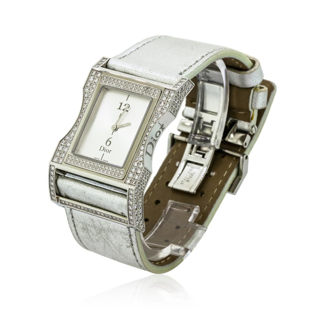 One lady's Christian Dior rectangle case wristwatch with a diamond bezel featuring: stainless steel and silver leather strap weighing 57.7 grams. The watch has a quartz movement with silver dial with luminous stainless steel hands, and the factory diamond set bezel.