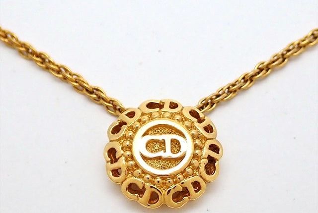 One Christian Dior Gold-tone Round Logo Pendant Necklace. Item is sold AS-IS. All available information is listed in the description and shown in the photo. Christian Dior necklace features gold-tone hardware, round pendant that has brand's signature CD logo at center set against a pebbled background and CD letters roll around the edge, complete with lobster claw closure.