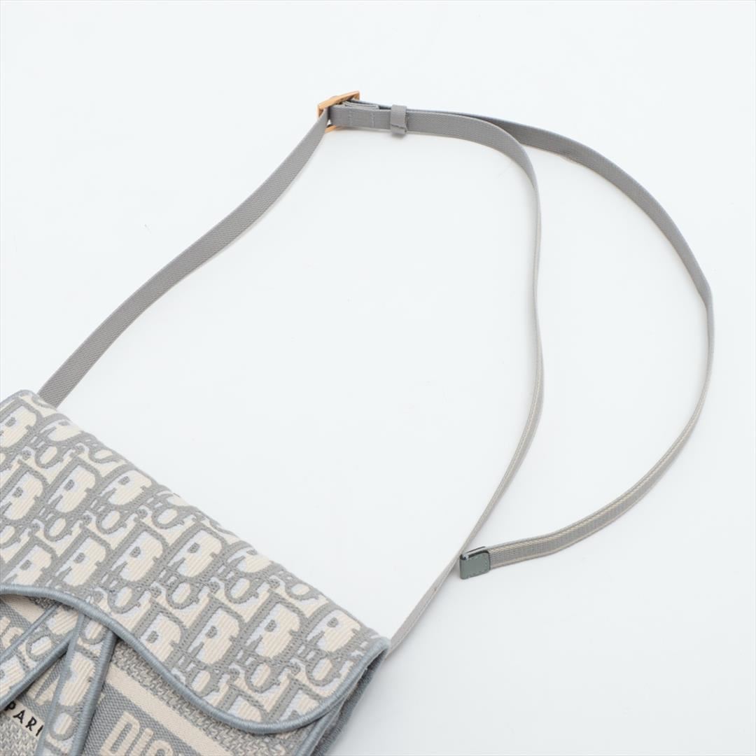 The Saddle slim pouch retains the emblematic codes of the Saddle line with its asymmetrical flap and gold-finish metal 'D' stirrup magnetic clasp. The accessory is crafted with gray Dior Oblique embroidery. It may be worn crossbody or at the waist with it