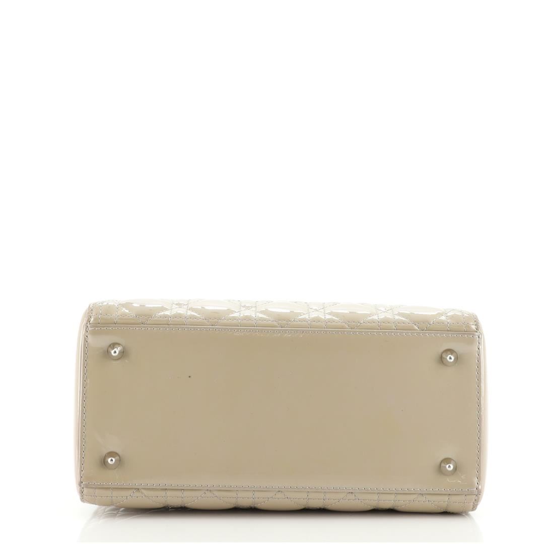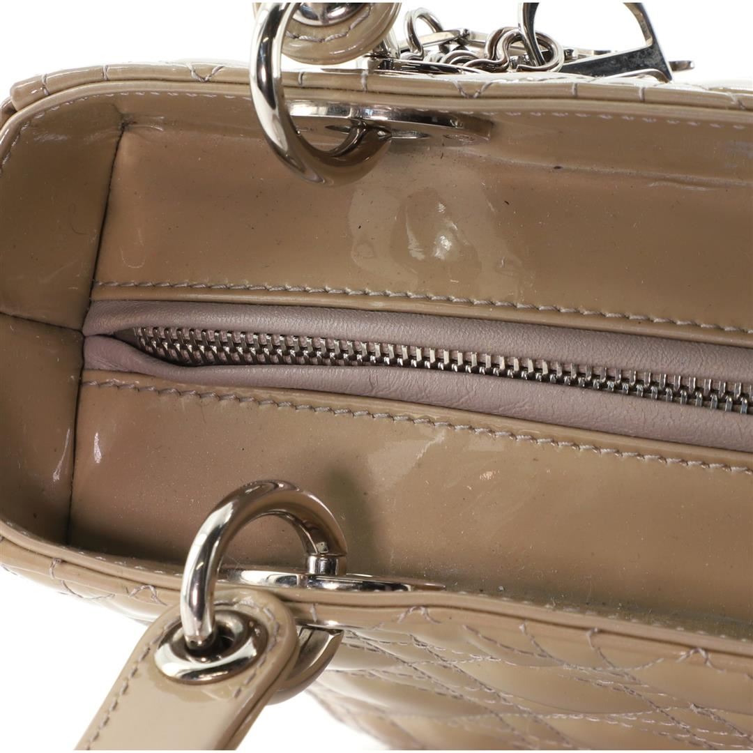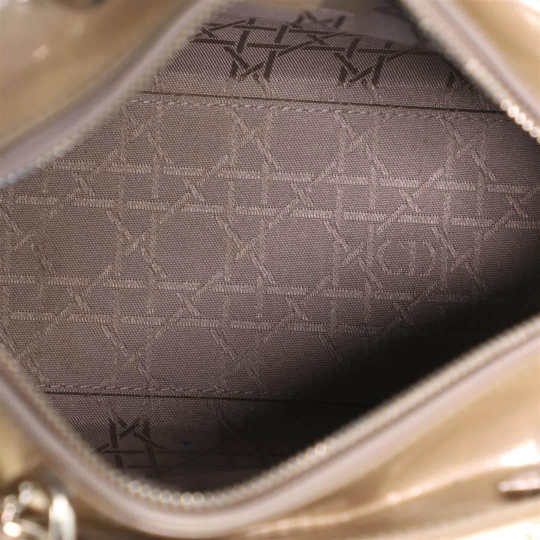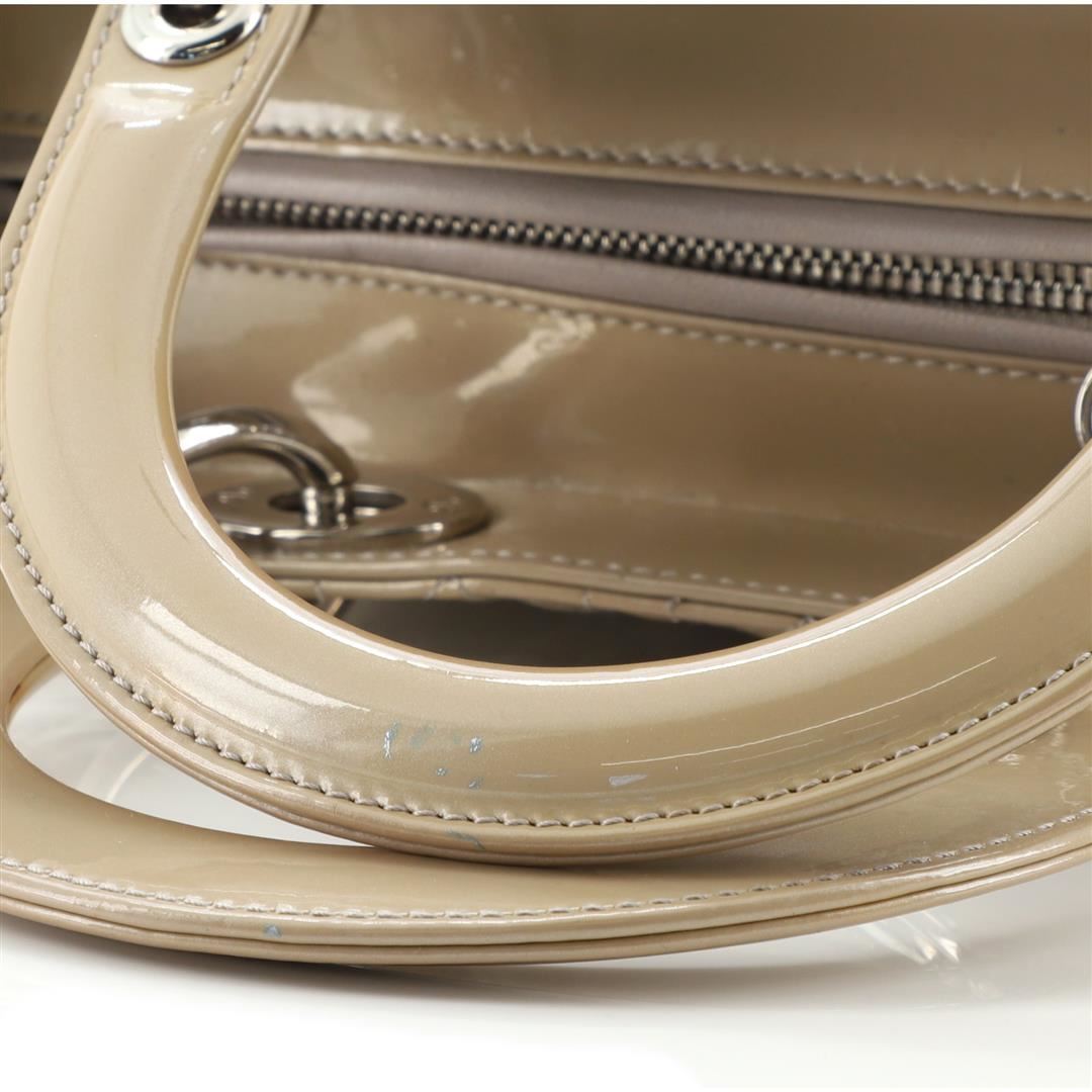 Christian Dior Lady Dior Bag Cannage Quilt Patent Medium. All available information is listed in the description and shown in the photos. Christian Dior Lady Dior Bag Cannage Quilt Patent Medium. Odor in interior. Wear, discoloration and small stains on exterior, handles and strap, creasing on strap. Pen marks in interior, scratches on hardware.