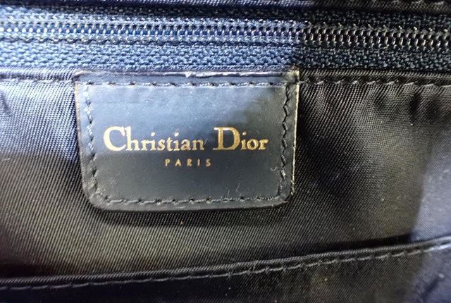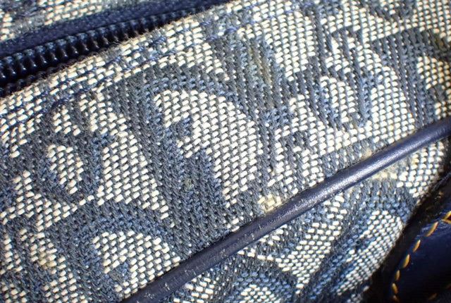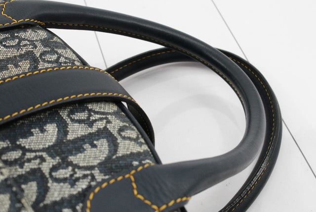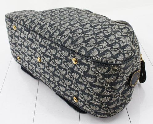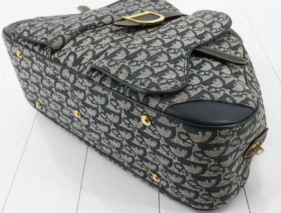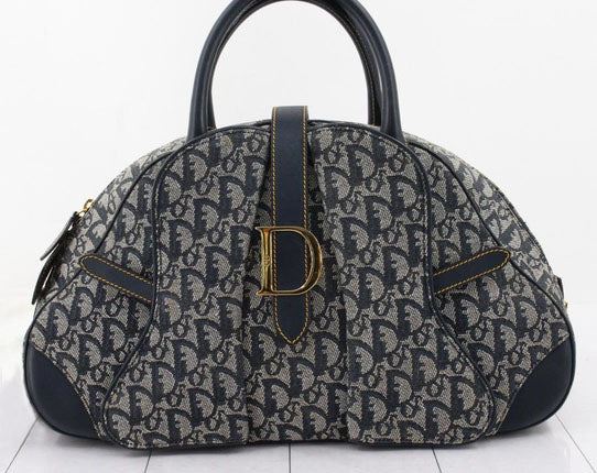 Christian Dior Saddle Medium bowler bag is crafted from navy blue Diorissimo canvas, dual rolled navy blue leather handles, protective base studs, cross-over strap with Dior clasp, and gold-tone hardware. Its zip closure opens to a black fabric interior.