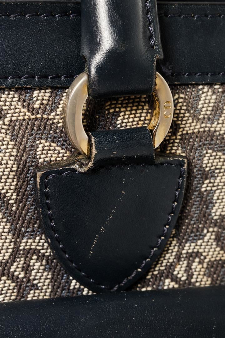 Christian Dior Navy Blue Logo Trotter Canvas Leather Small Tote Bag. All available information is listed in the description and shown in the photos. This tote features navy Dior jacquard canvas with navy leather trim and gold-tone hardware, dual navy rolled leather handles, front pocket with tab closure and an open, easy to get into top, five protective studs at the base, navy nylon lining with zippered pocket and flat pocket. Handle Drop 4", Height 8.5", Width 9.5", Depth 5"