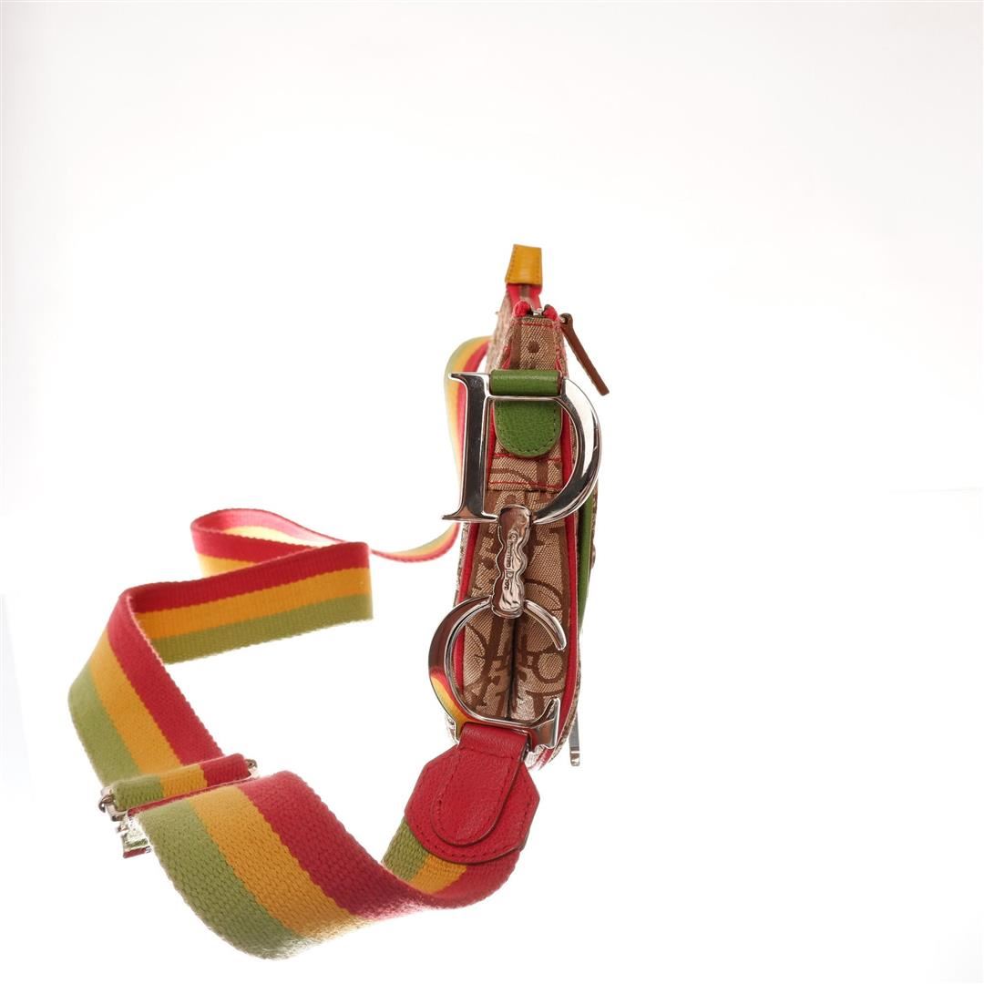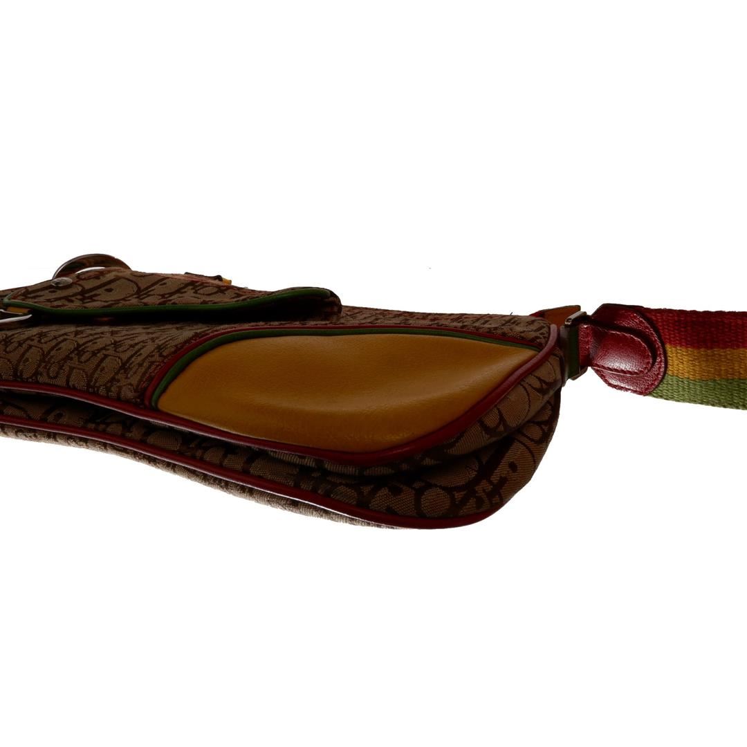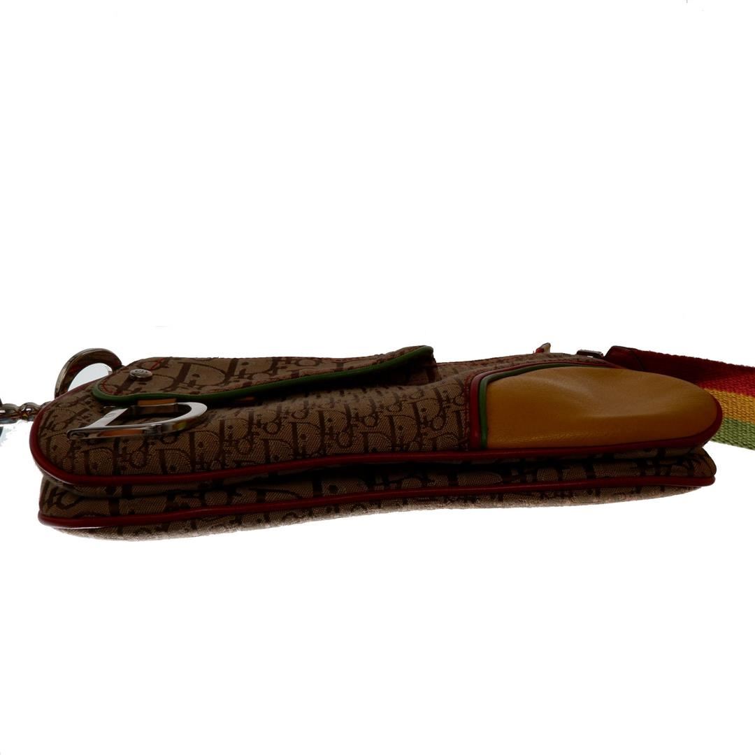 Brown Rasta monogram Christian Dior double saddle shoulder bag features one pocket exterior with iconic silver-tone D logo, single zip closure, adjustable Rasta leather strap with large signature CD logo, single compartment, brown textile lining interior,