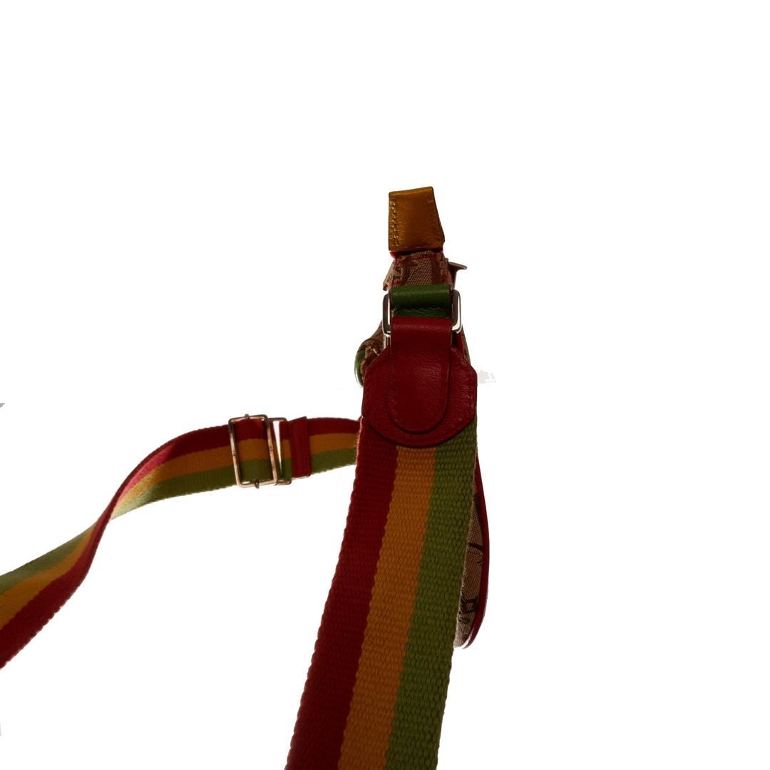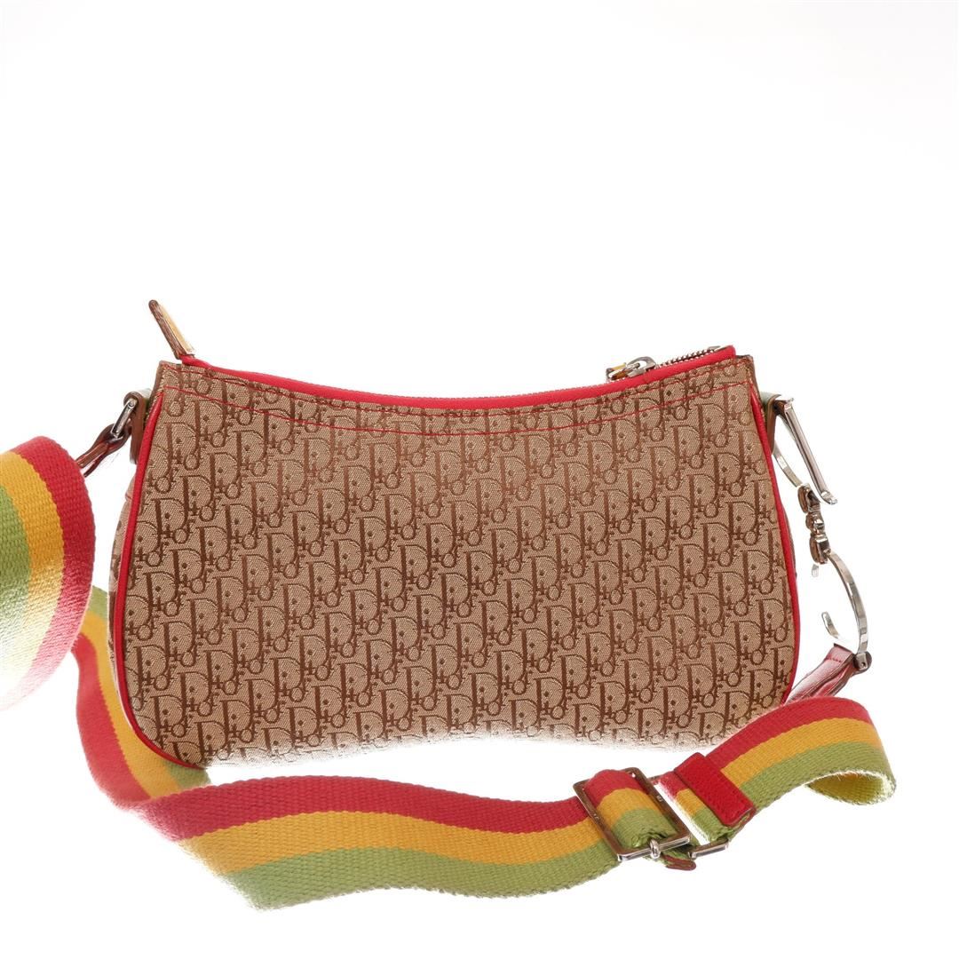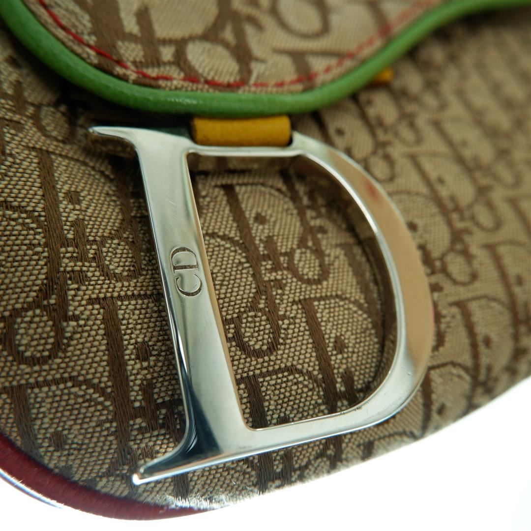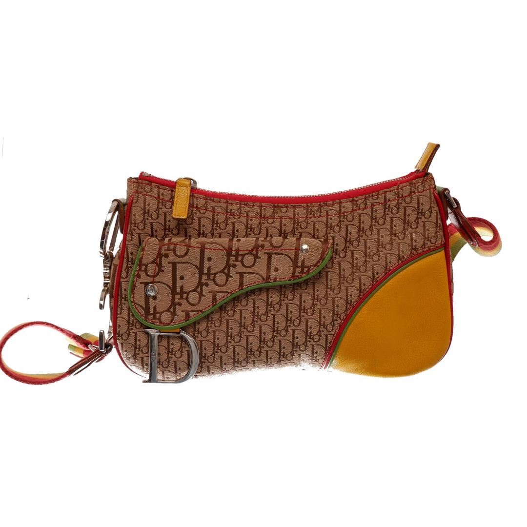 Brown Rasta monogram Christian Dior double saddle shoulder bag features one pocket exterior with iconic silver-tone D logo, single zip closure, adjustable Rasta leather strap with large signature CD logo, single compartment, brown textile lining interior,