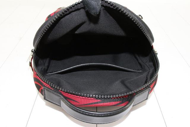 Christian Dior Red Black Nylon Tribal Rider Print Pattern Mini Shoulder Bag. All available information is listed in the description and shown in the photos. Christian Dior Mini shoulder bag features red and black nylon with Rider Tribal pattern print, silver-tone hardware, detachable black canvas shoulder strap, front pocket with zipper closure, top flat leather handle, zipper closure at top that will open to black canvas-lined interior with one slip pocket. Height 9", Width 7.5", Depth 2"