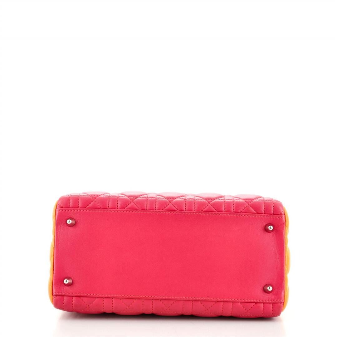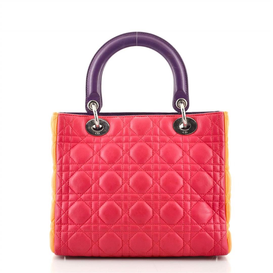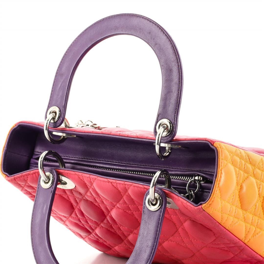 One Christian Dior Tricolor Lady Dior Bag Cannage Quilt Grained Lambskin Medium. Item is sold AS-IS. All available information is listed in the description and shown in the photo. Christian Dior Tricolor Lady Dior Bag Cannage Quilt Grained Lambskin Medium. Odor in interior. Creasing, wear and scuffs on exterior, strap and in interior, indentations on base, moderate wear on opening corners. Marks and indentations on handles, peeling on strap base edge, scratches and tarnish on hardware.