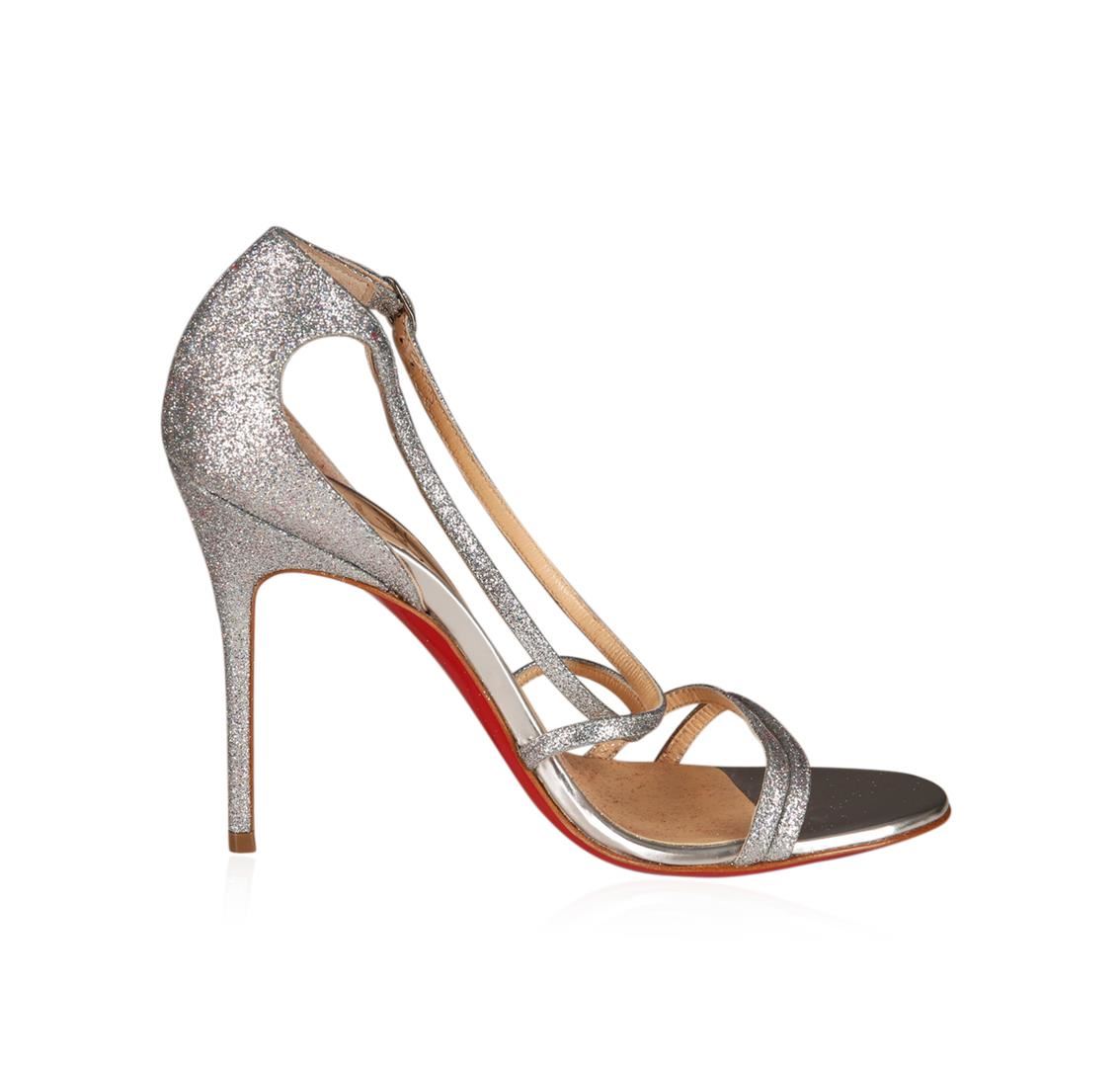 Christian Louboutin Gwynitta 100 silver glitter open-toed sandal. Straps cross over vamp. Fine-grain glittered PVC with metallic leather trim. Open toe. Silvertone hardware. Creamy leather lining. Signature red leather outsole. Heel height: 100mm. Size 36. Made in Italy.