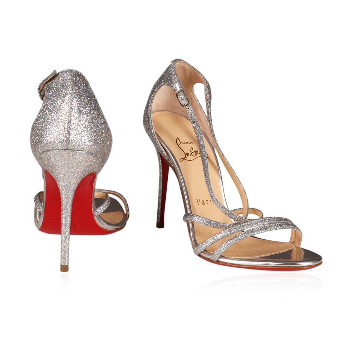 Christian Louboutin Gwynitta 100 silver glitter open-toed sandal. Straps cross over vamp. Fine-grain glittered PVC with metallic leather trim. Open toe. Silvertone hardware. Creamy leather lining. Signature red leather outsole. Heel height: 100mm. Size 36. Made in Italy.