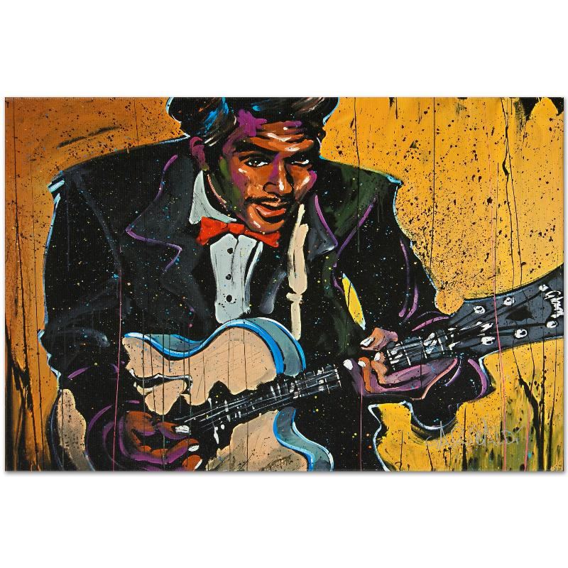 Combining his passions for music and art, David Garibaldi creates stunning visual poetry. "Chuck Berry (Chuck)" is a limited edition giclee on stretched canvas, numbered and bearing the artist's authorized signature. This piece comes gallery wrapped. Includes Certificate of Authenticity! Measures approx. 48" x 60" (image).