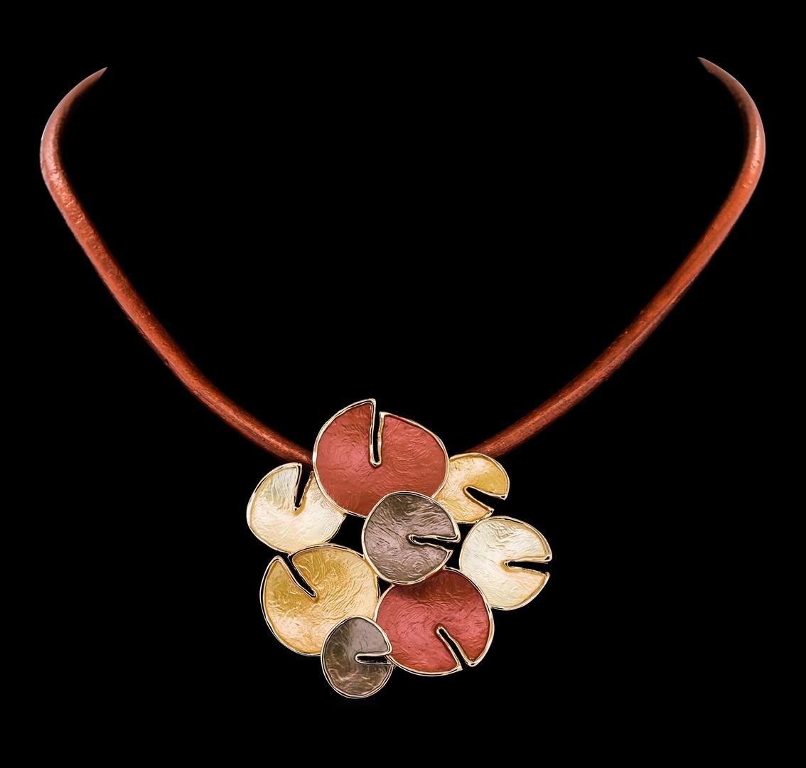 High end designer jewelry. Circle Cluster Pendant Leather Necklace - Rose Gold Plated. Rose Gld Plated/3" Ext Clasp. Tricolor/ Rose. 16inches. Total Weight: 22.4 grams.
