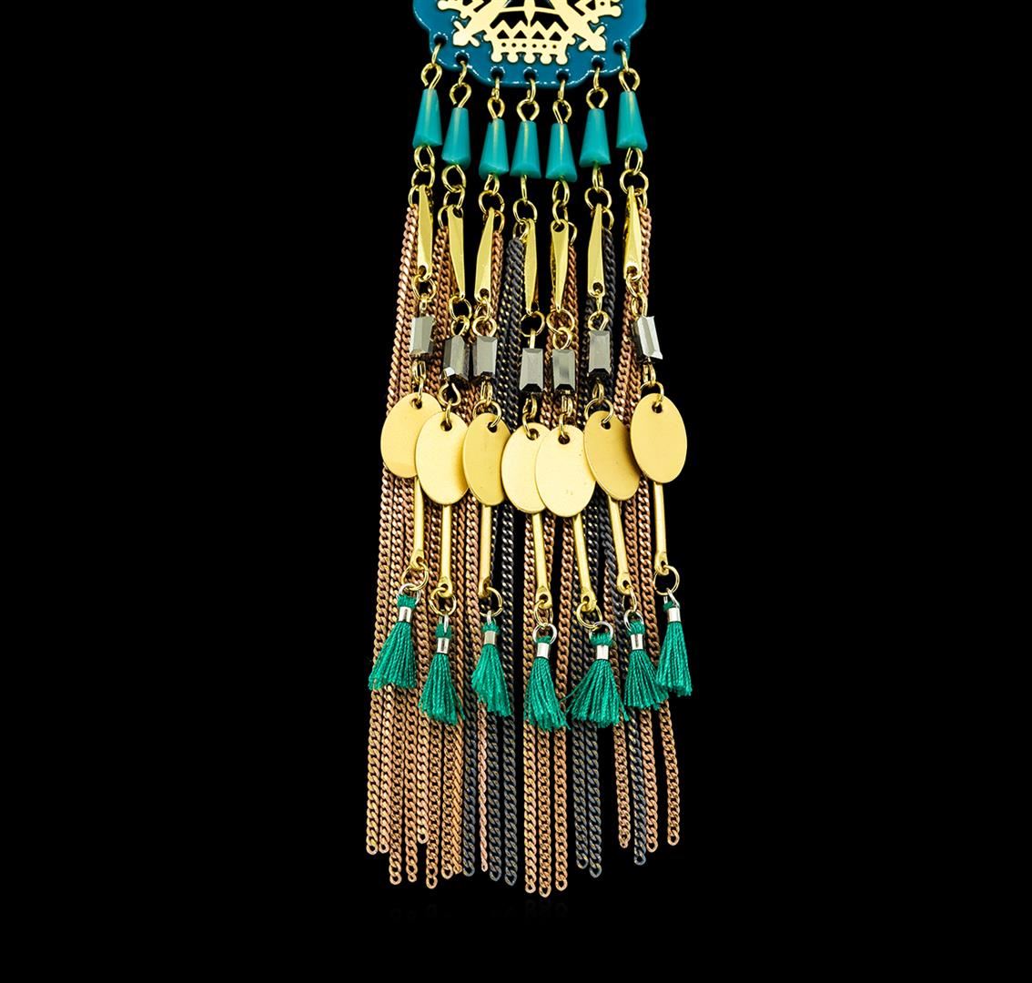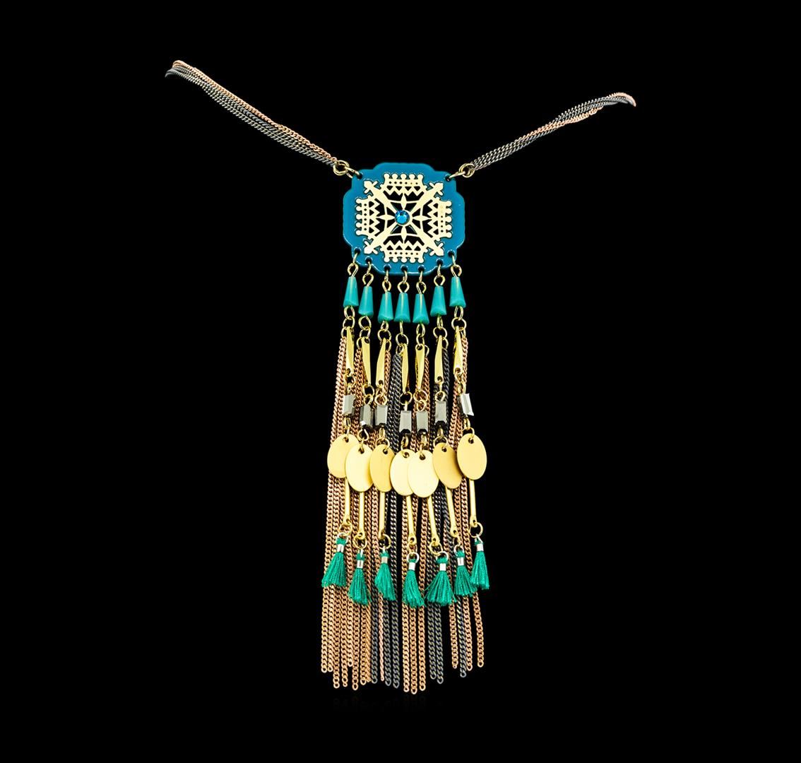 High end designer jewelry. Circle Tassel Chain Necklace - Gold Plated. Gold Plated Chain. Gold/ Turq. Long. Total Weight: 36.4 grams.