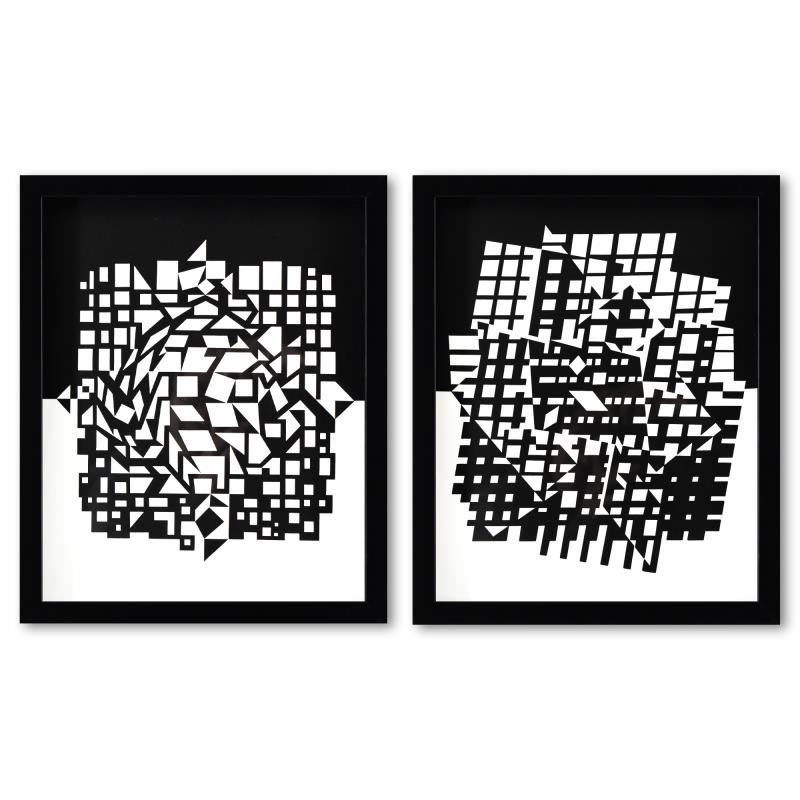 "Citra et Ixion-II de la serie Croises (Diptych)" is a set of heliogravure prints on paper, published in 1973, by Victor Vasarely (1908-1997). These pieces come custom framed, with a letter of authenticity and with a 1976 Vasarely paperback. Measures approx. 12.5" x 15" (frame), 10" x 13" (image).