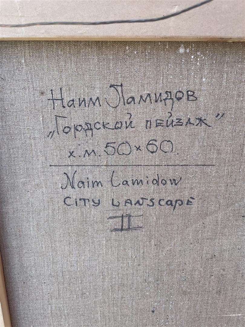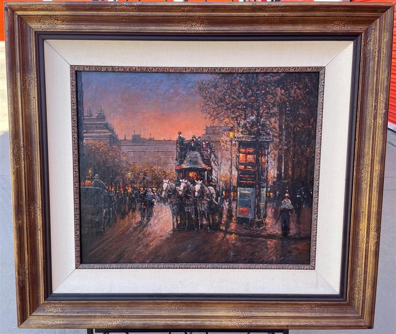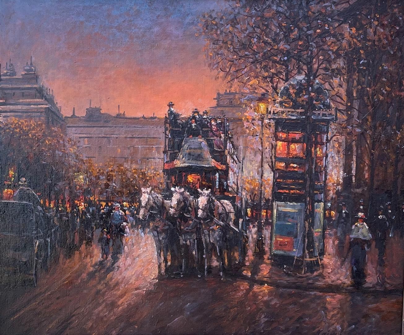 Three white horses pull a carriage of people through a crowded city street in this Impressionistic oil on canvas by Naim Lamidov. The painting measures 19.625 x 23.625; framed image measures approx. 31.625 x 35.625.