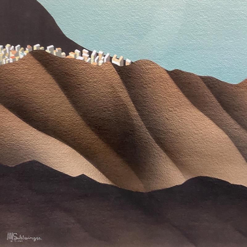 "City at the Lake" is an original mixed media airbrush painting on paper by William Schlesinger (1915-2011), dated 1987 and hand signed by the artist. This piece comes framed. Includes Letter of Authenticity. Measures approx. 29" x 36.5" (frame), 21" x 28" (image). There is minor wear on the frame.