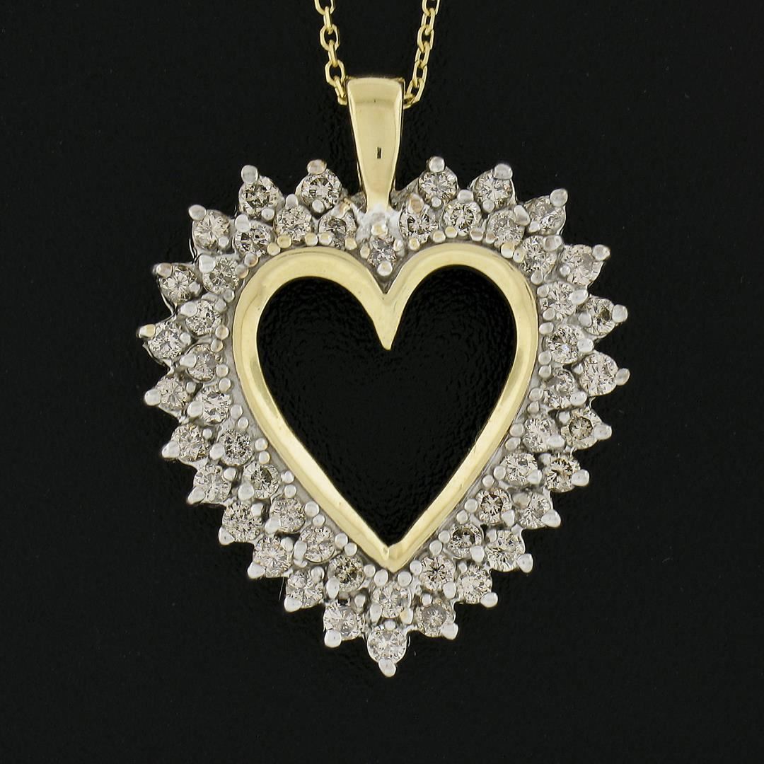 A solid 14k yellow & white gold heart pendant necklace, with 51 round cut natural diamonds (Fancy Light Champagne Color- SI2-I2 ; 1ctw) . Adjustable 16 or 18 inch cable link chain, 5.69 grams total weight, pendant measures 26.8x21.8mm.