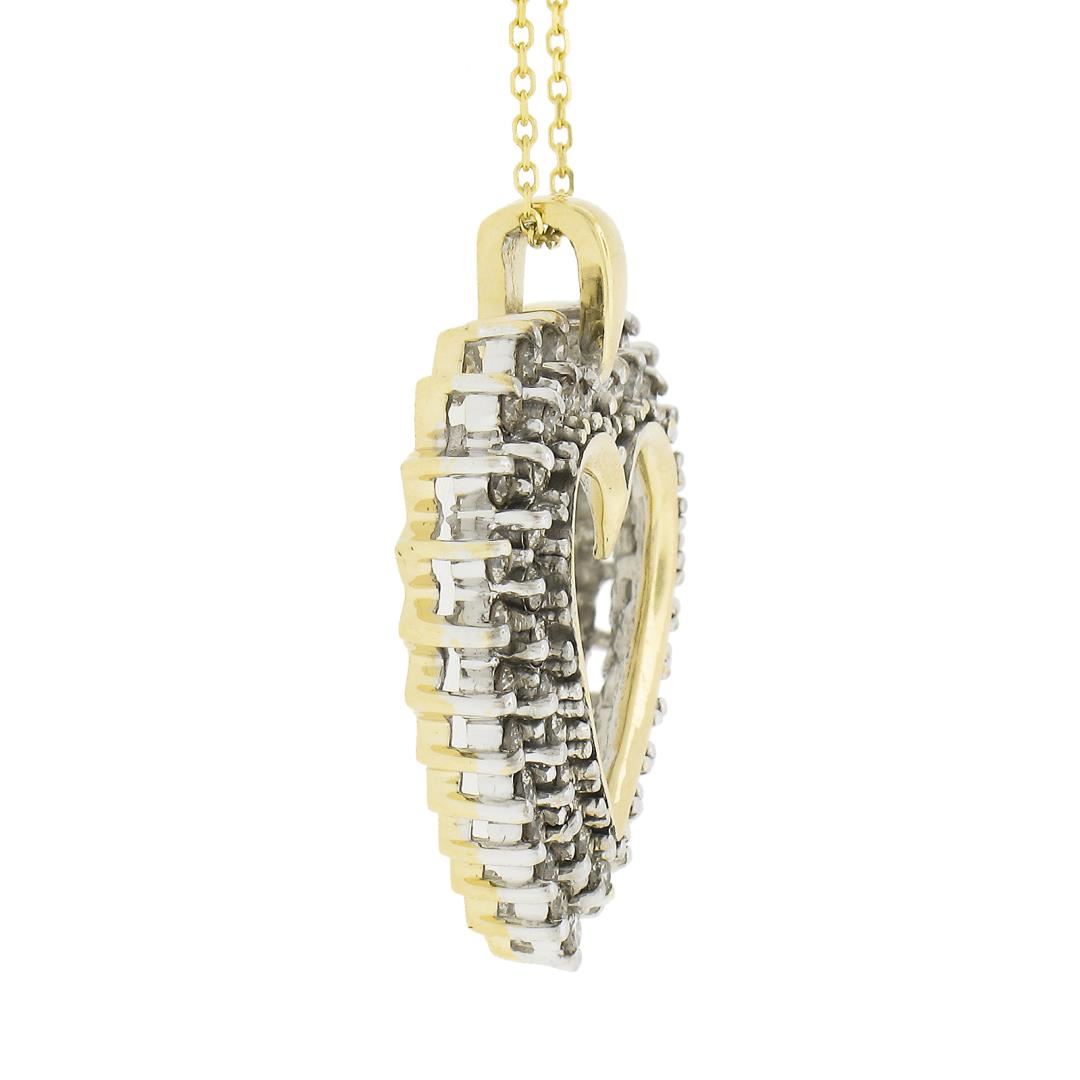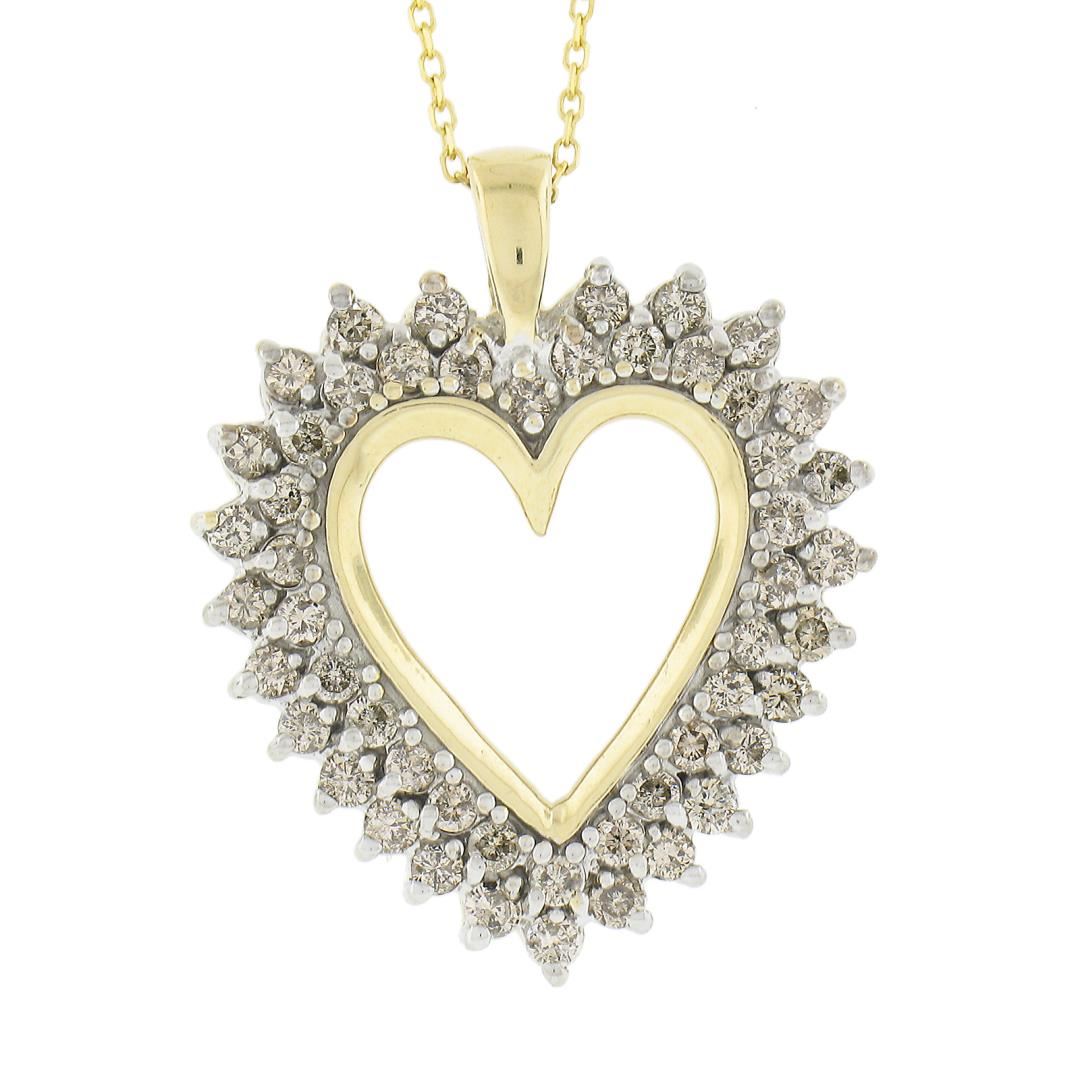 A solid 14k yellow & white gold heart pendant necklace, with 51 round cut natural diamonds (Fancy Light Champagne Color- SI2-I2 ; 1ctw) . Adjustable 16 or 18 inch cable link chain, 5.69 grams total weight, pendant measures 26.8x21.8mm.