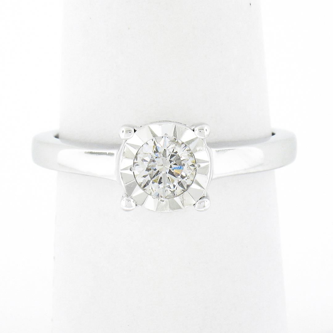 A solid 14k white gold classic engagement ring, with 1 round brilliant cut natural diamond (G - I1 ; 0.35ct). The ring is size 7.0, weighs a total of 3.91 grams, and measures 6.95mm wide.