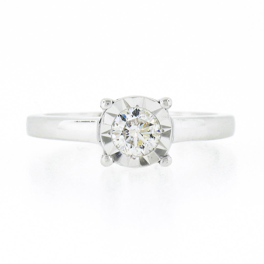 A solid 14k white gold classic engagement ring, with 1 round brilliant cut natural diamond (G - I1 ; 0.35ct). The ring is size 7.0, weighs a total of 3.91 grams, and measures 6.95mm wide.