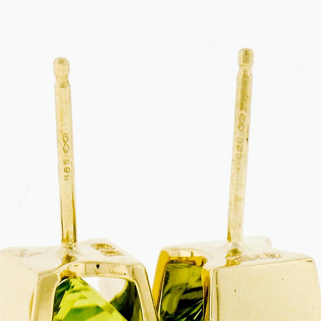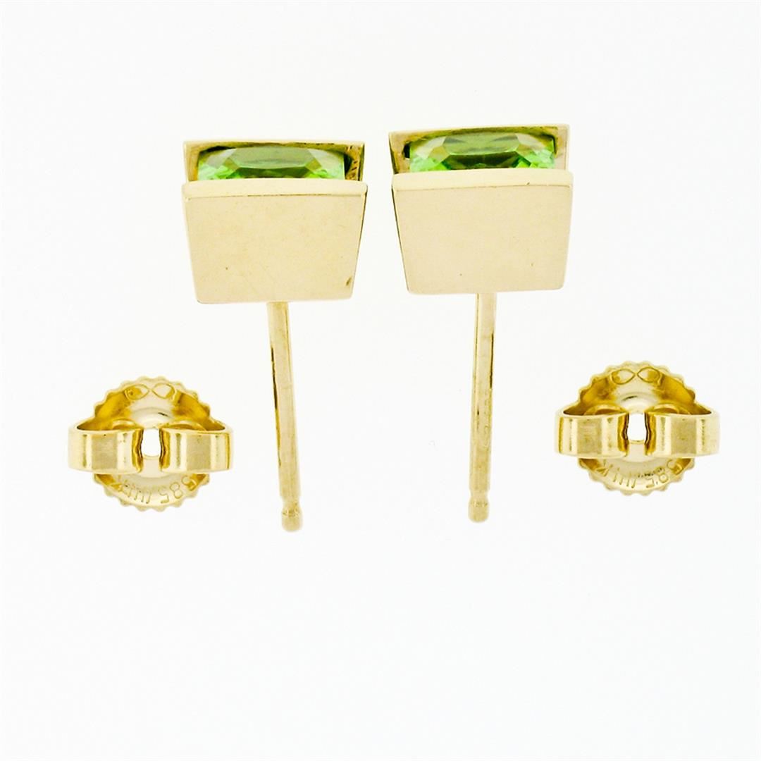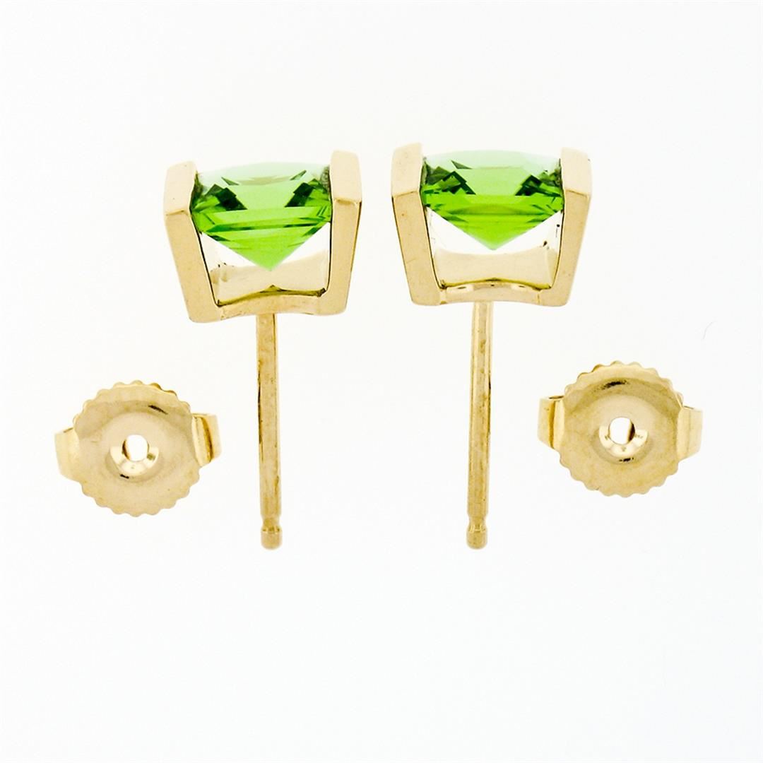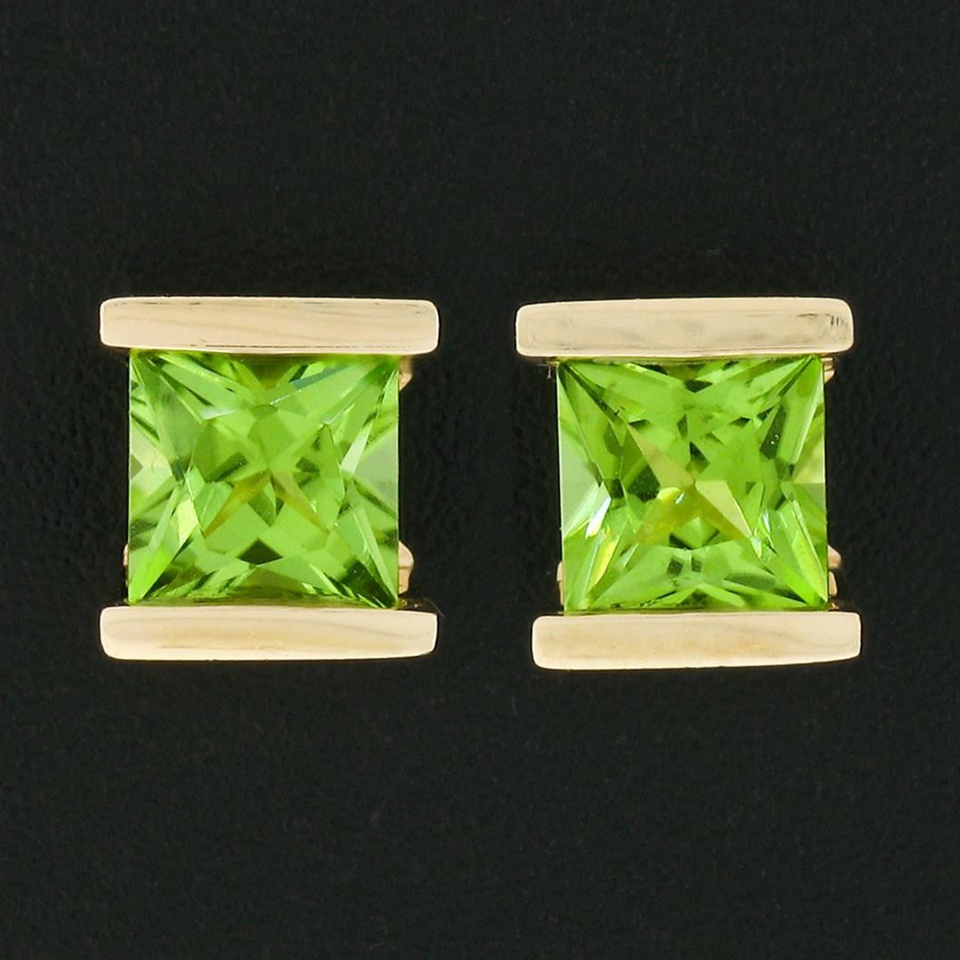 An estate solid 14k yellow gold stud earrings, with 2 sqaure cut natural peridots (5.9x5.9mm- 2.60ctw). The earrings measure approximately 7.50x8.10mm and weigh a total of 3.73 grams.