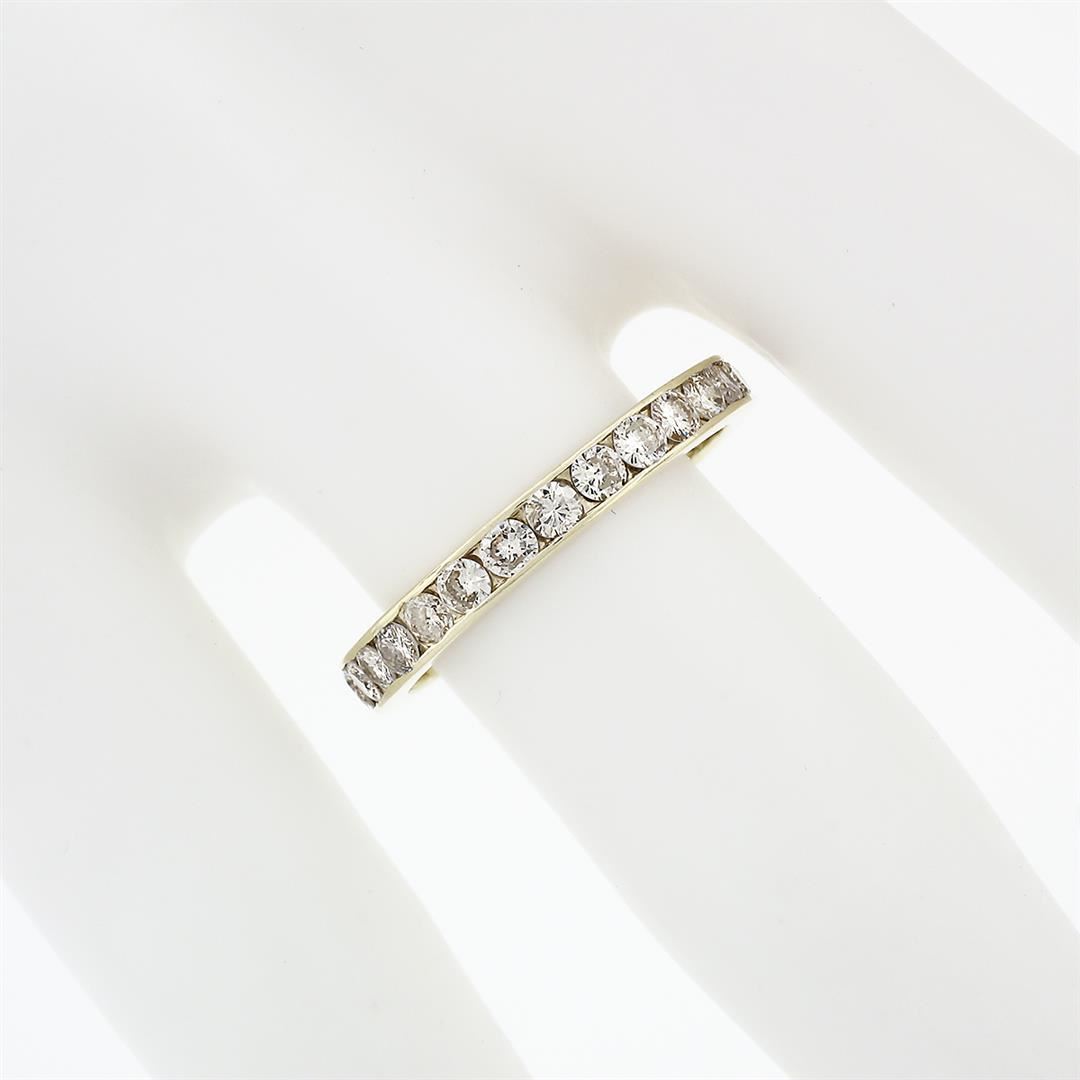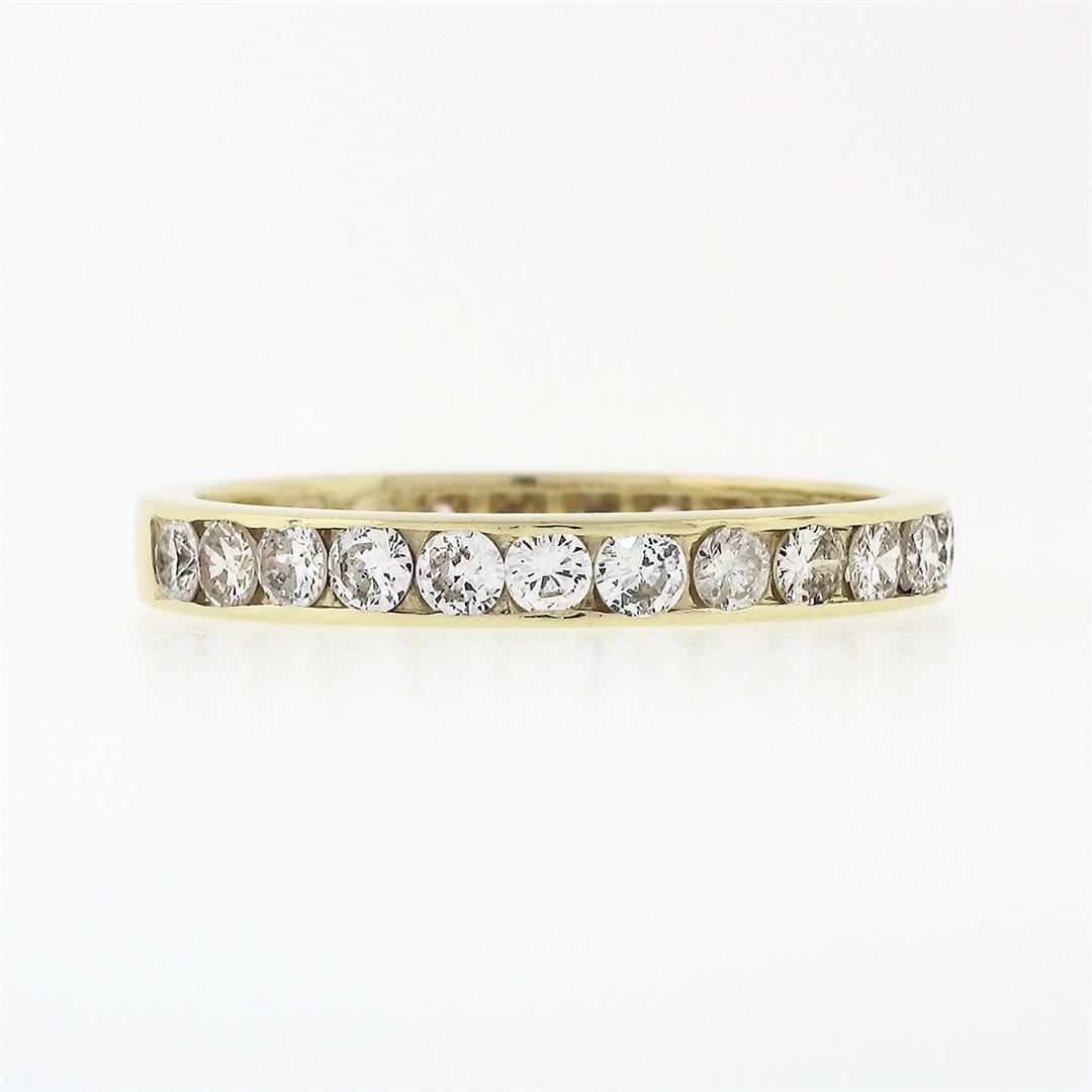 A solid 14k yellow gold wedding band ring, with 23 round brilliant cut natural diamonds (G/H - VS2/SI1 ; 1ctw). The ring is size 7.0, weighs a total of 2.15 grams, and measures 2.8mm wide.