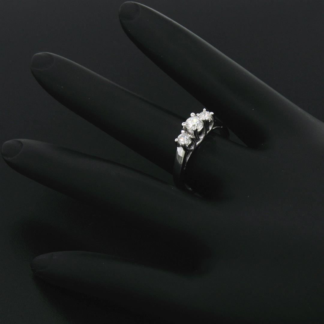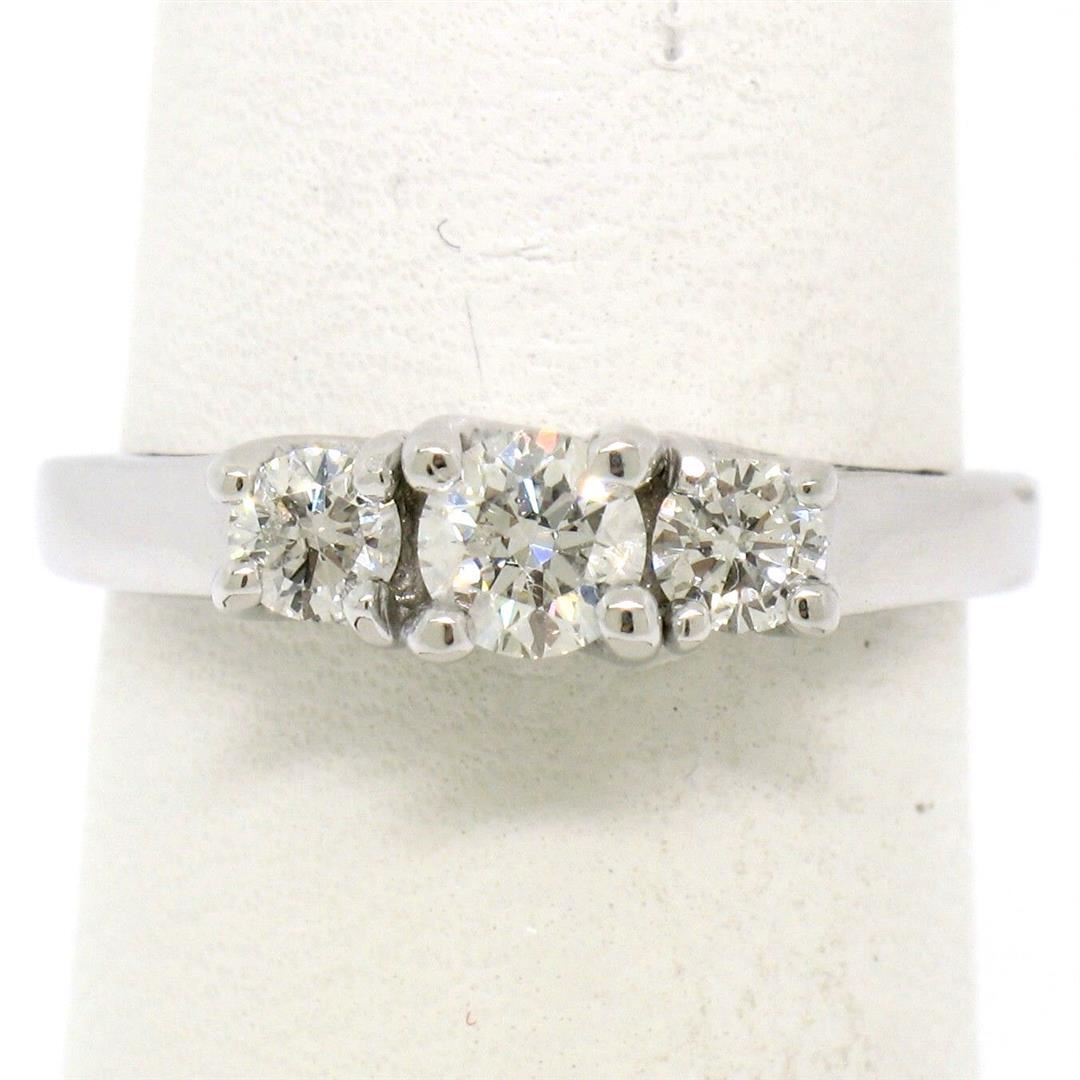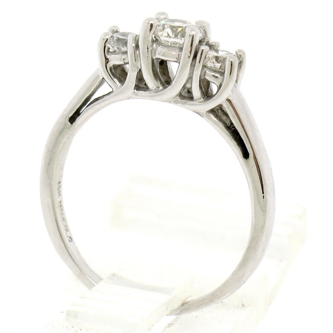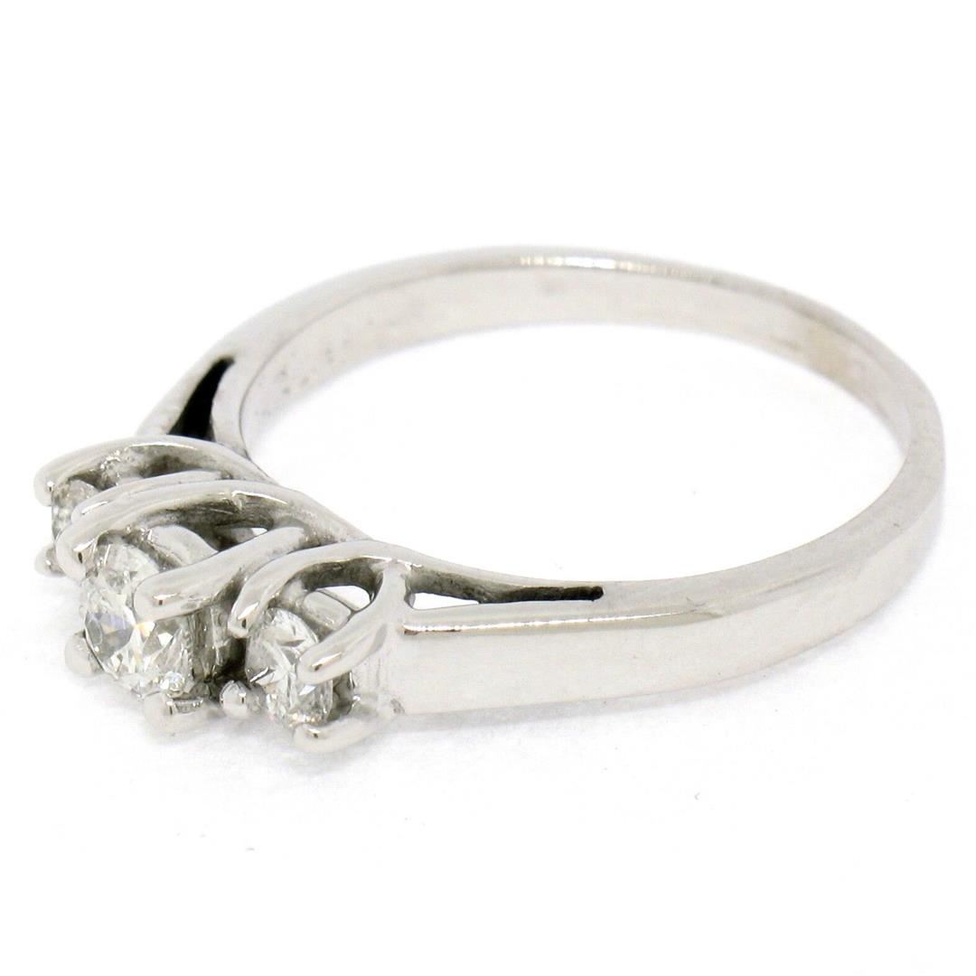 An estate solid 14k white gold three stones engagement ring, featuring 1 round brilliant cut natural diamonds (F/G- VS2 ; 0.25ct), and 2 round brilliant cut natural diamonds (F/G - VS2 ; 0.20ctw ). The ring is size 6.0, weighs a total of 3.1 grams, and me