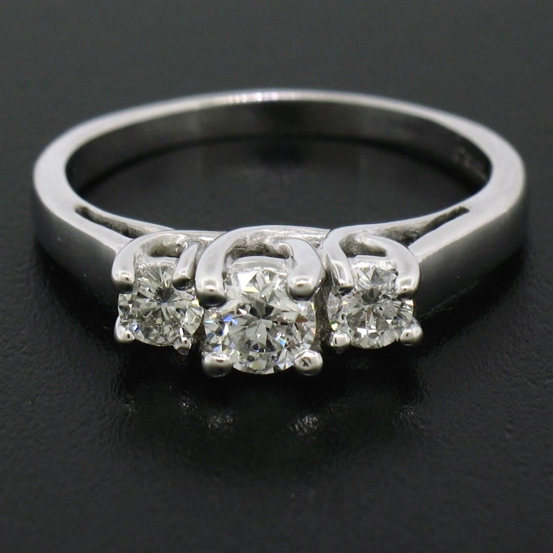 An estate solid 14k white gold three stones engagement ring, featuring 1 round brilliant cut natural diamonds (F/G- VS2 ; 0.25ct), and 2 round brilliant cut natural diamonds (F/G - VS2 ; 0.20ctw ). The ring is size 6.0, weighs a total of 3.1 grams, and measures 4.50mm wide.