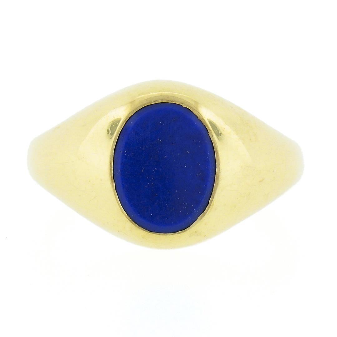 A solid 14k yellow gold ring, with 1 oval cabochon cut natural lapis (8.7x6.8mm). The ring is size 6.5, weighs a total of 5.34 grams, and measures 11.65mm wide.