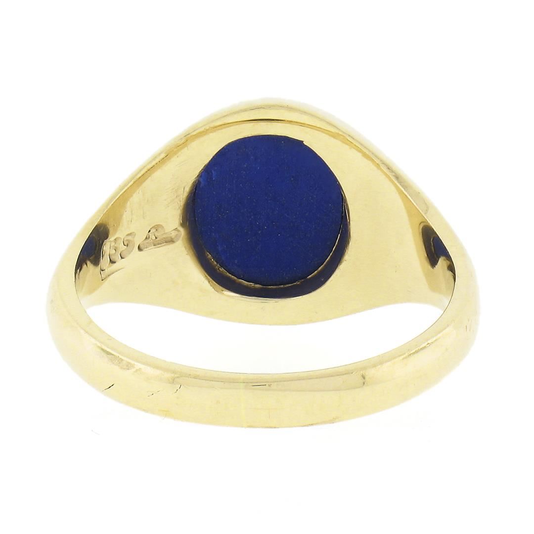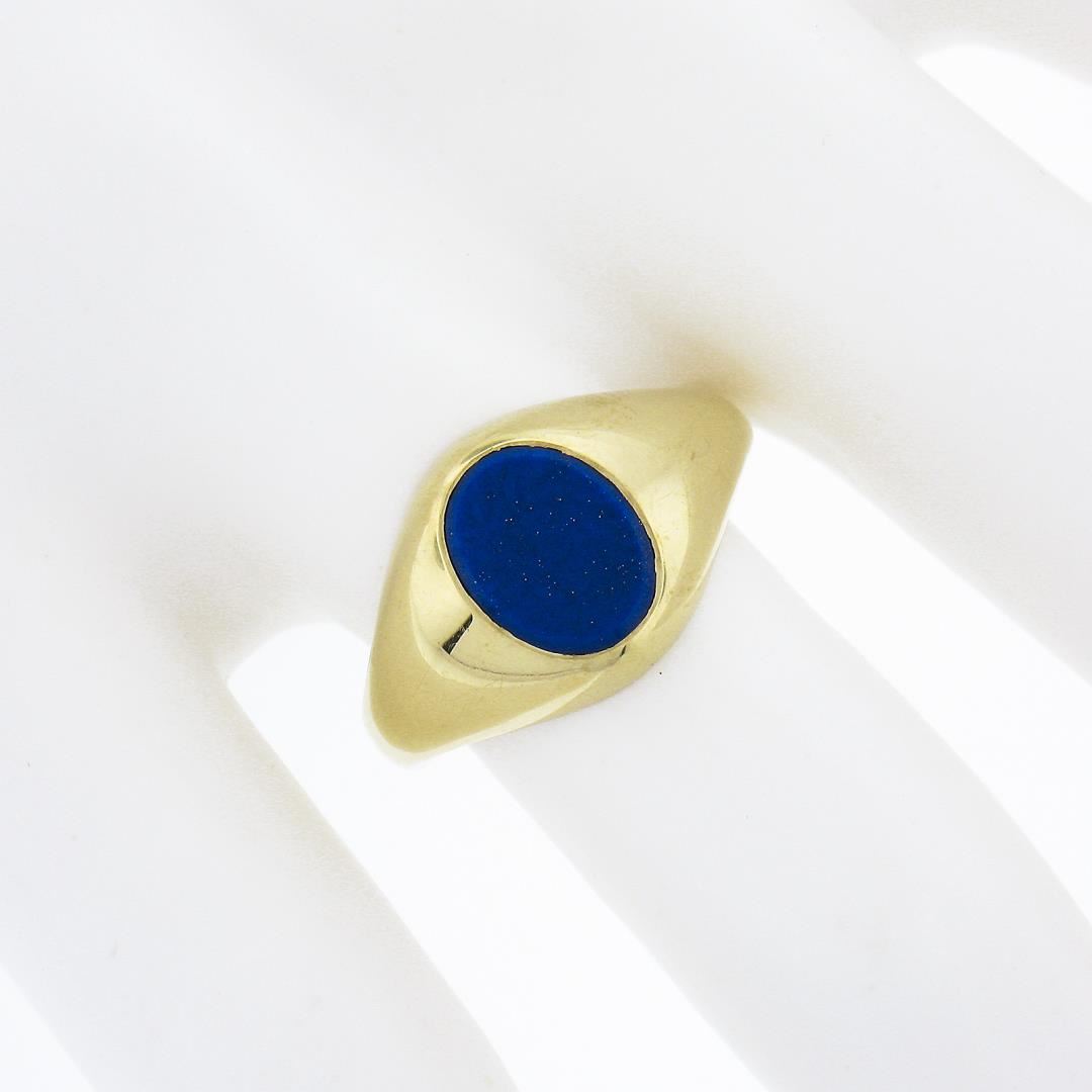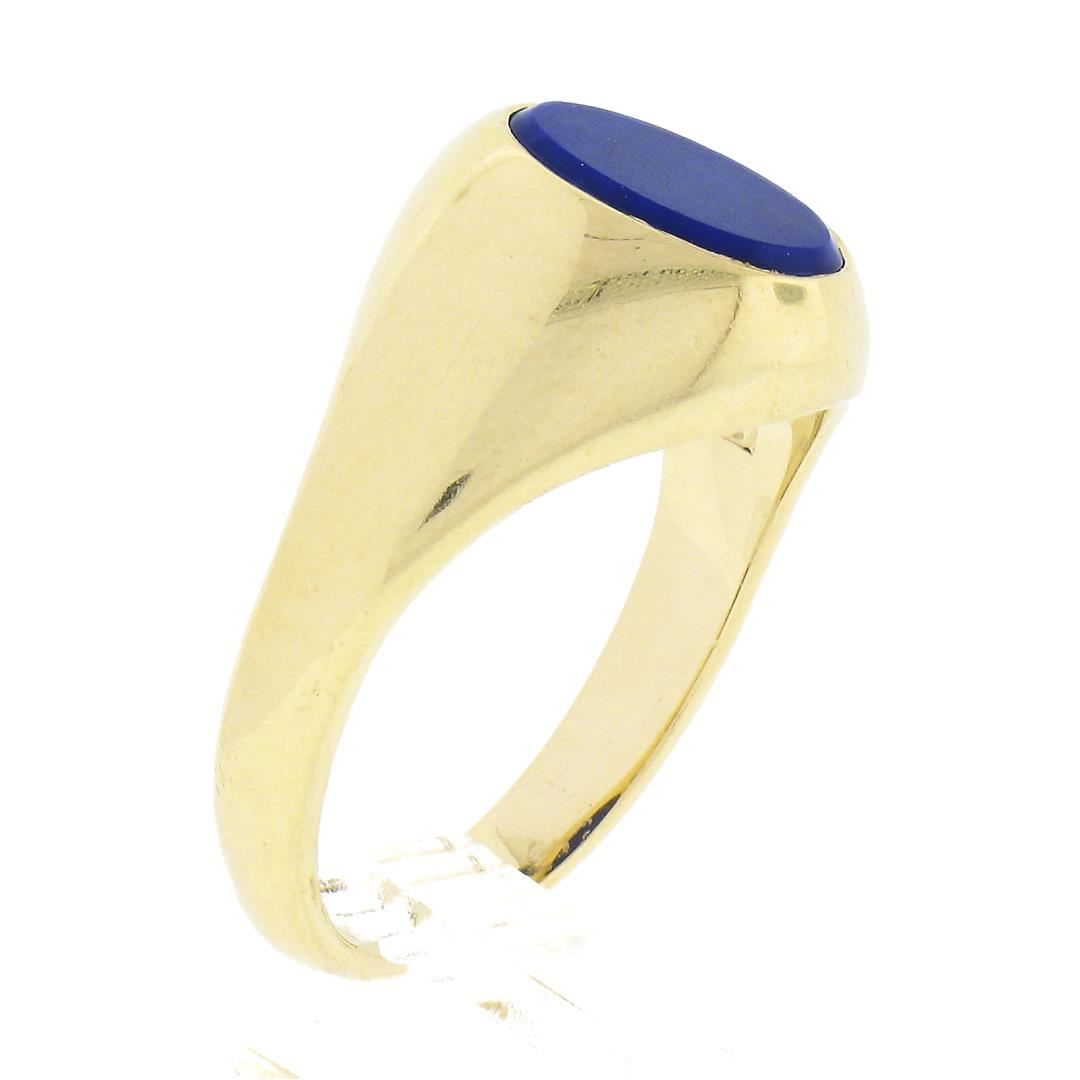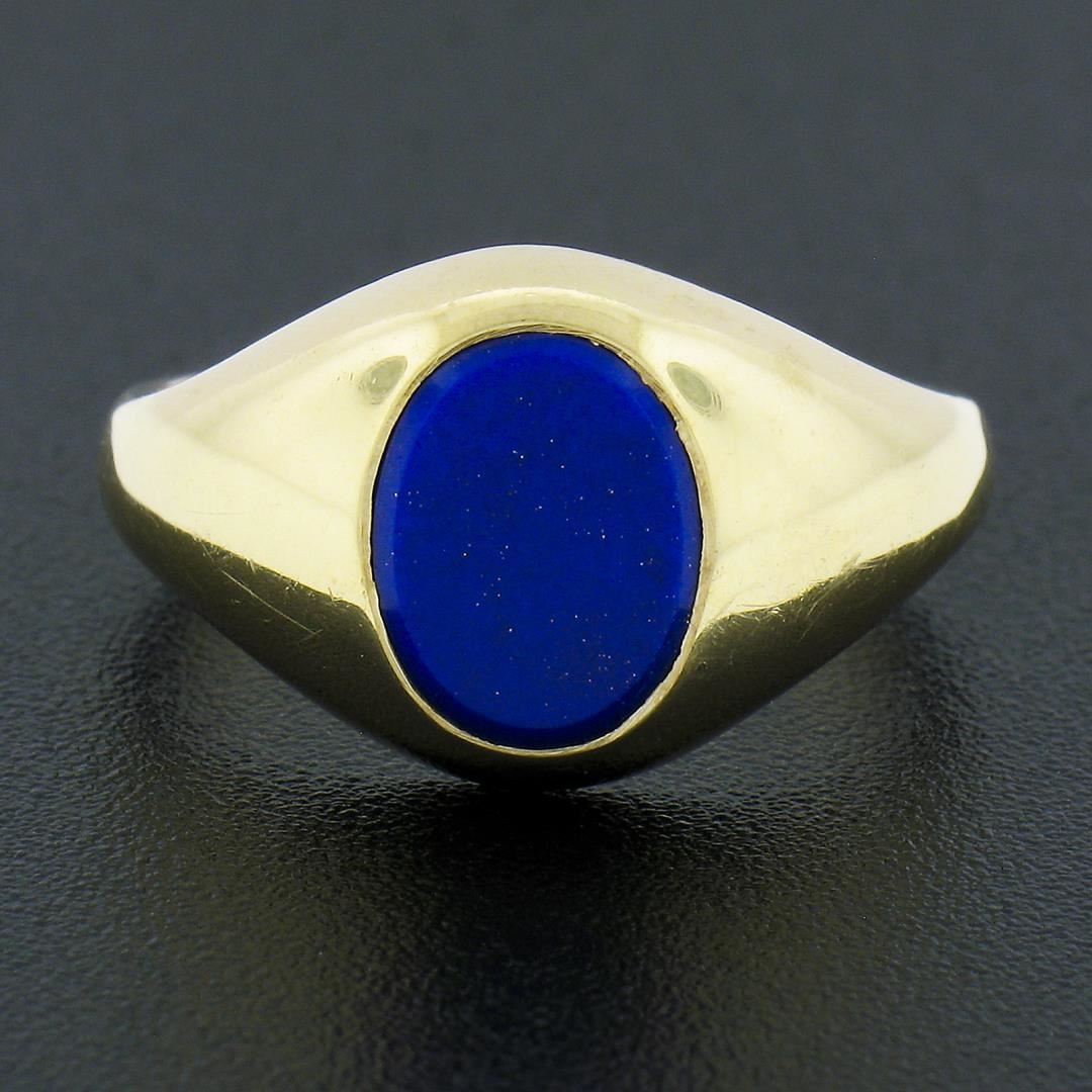 A solid 14k yellow gold ring, with 1 oval cabochon cut natural lapis (8.7x6.8mm). The ring is size 6.5, weighs a total of 5.34 grams, and measures 11.65mm wide.