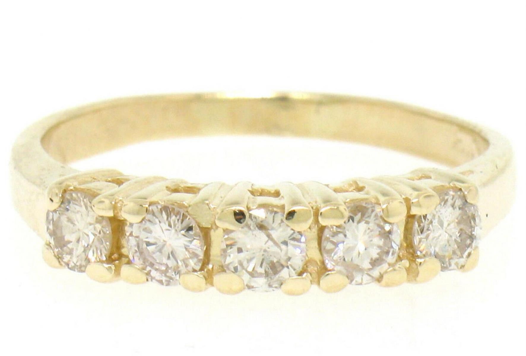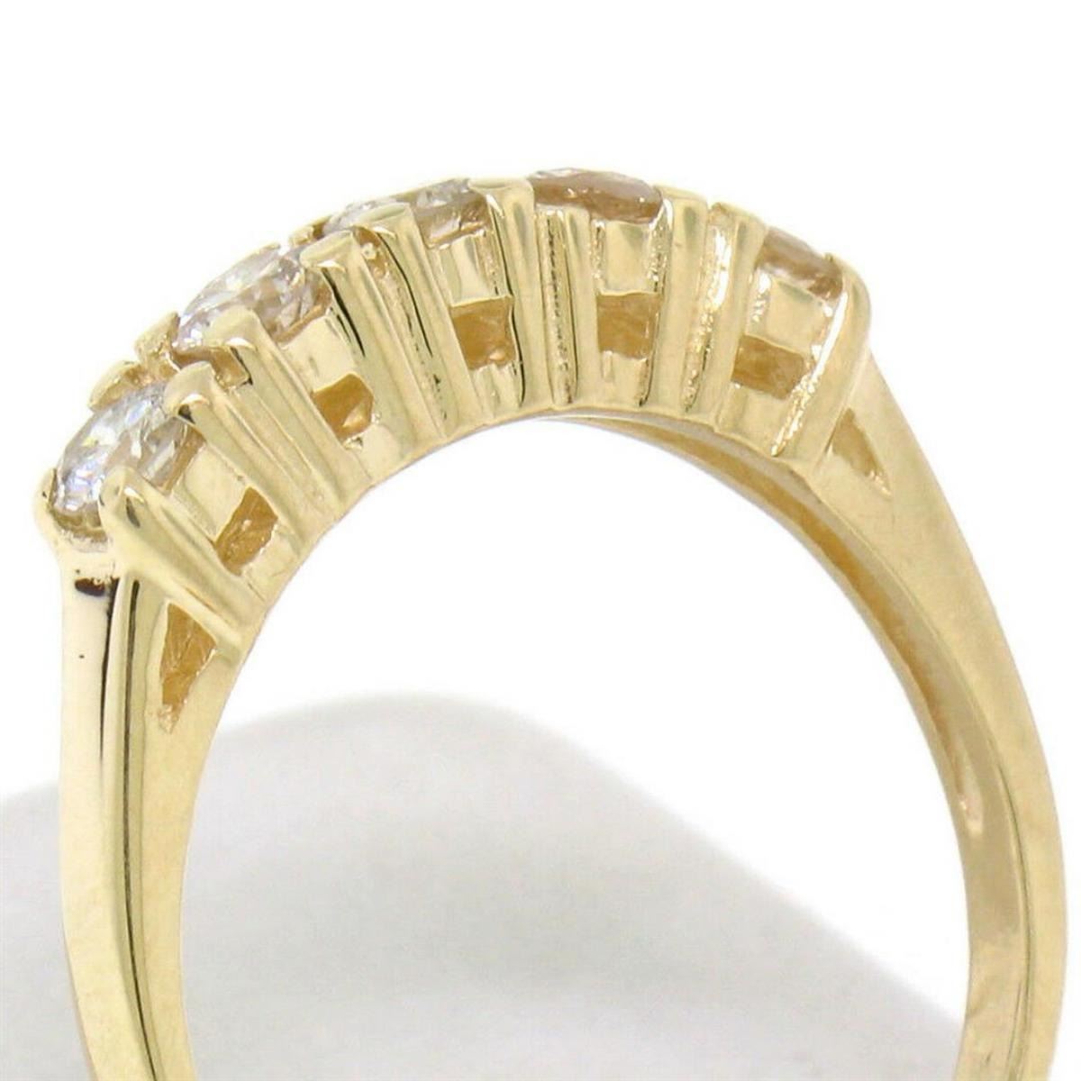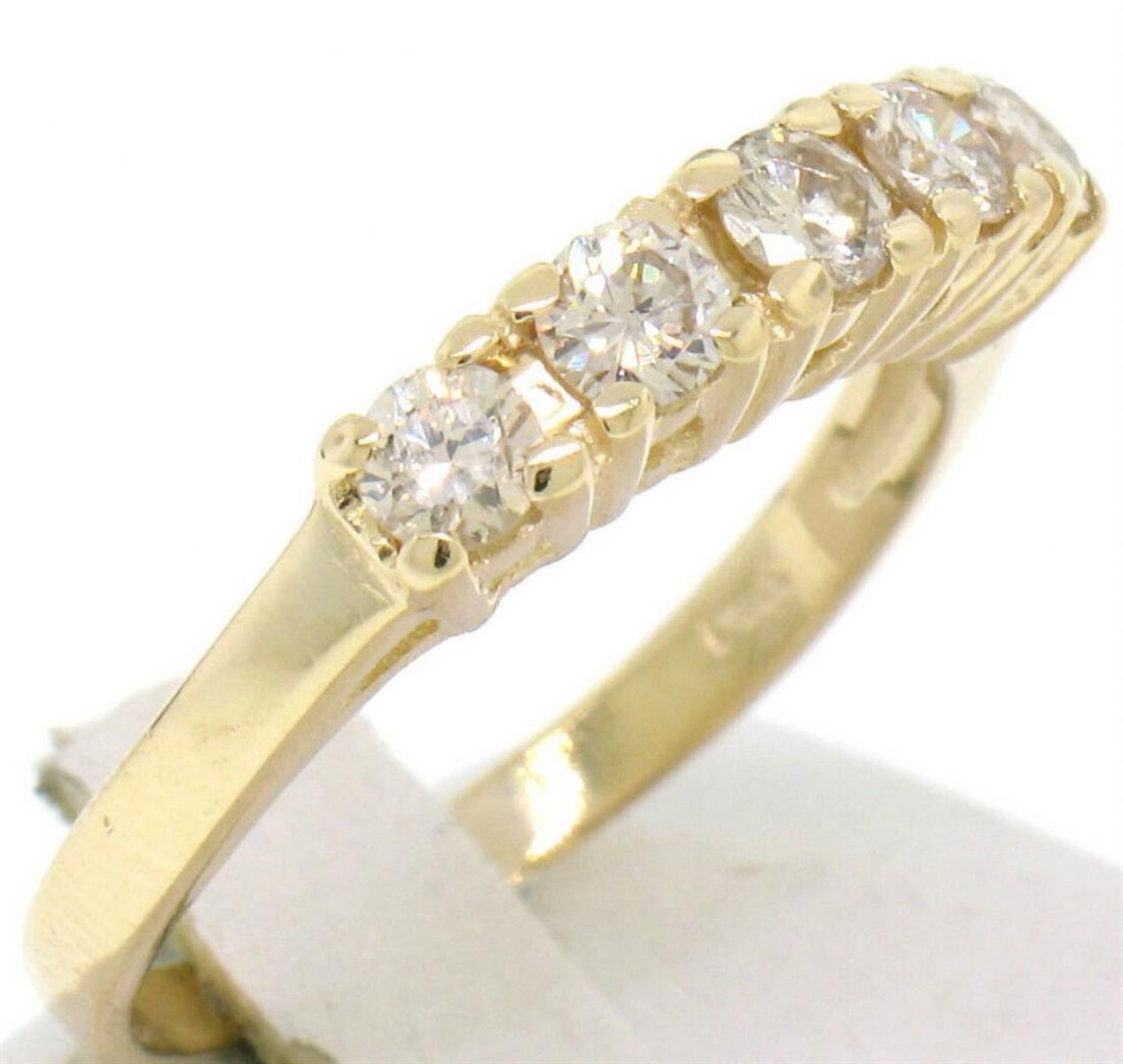 A classic 14kt yellow gold wedding band featuring 5 prong set round brilliant diamonds (H - SI1) totaling approximately 0.75 carats. The ring is size 8.5, weighs a total of 3.60 grams, and measures 4.09mm wide.